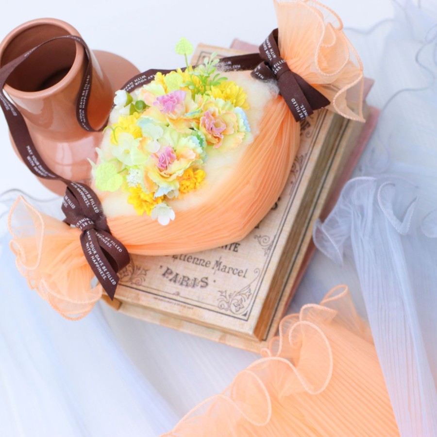 やわらかなオレンジ色のラッピングの中央には、パステルカラーの花々をやさしくまとめ、まるでスイーツのような楽しい雰囲気に仕上げています。