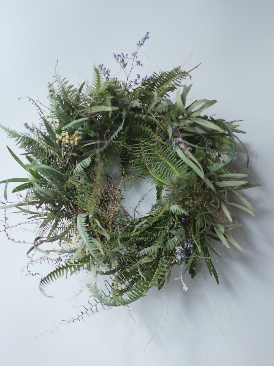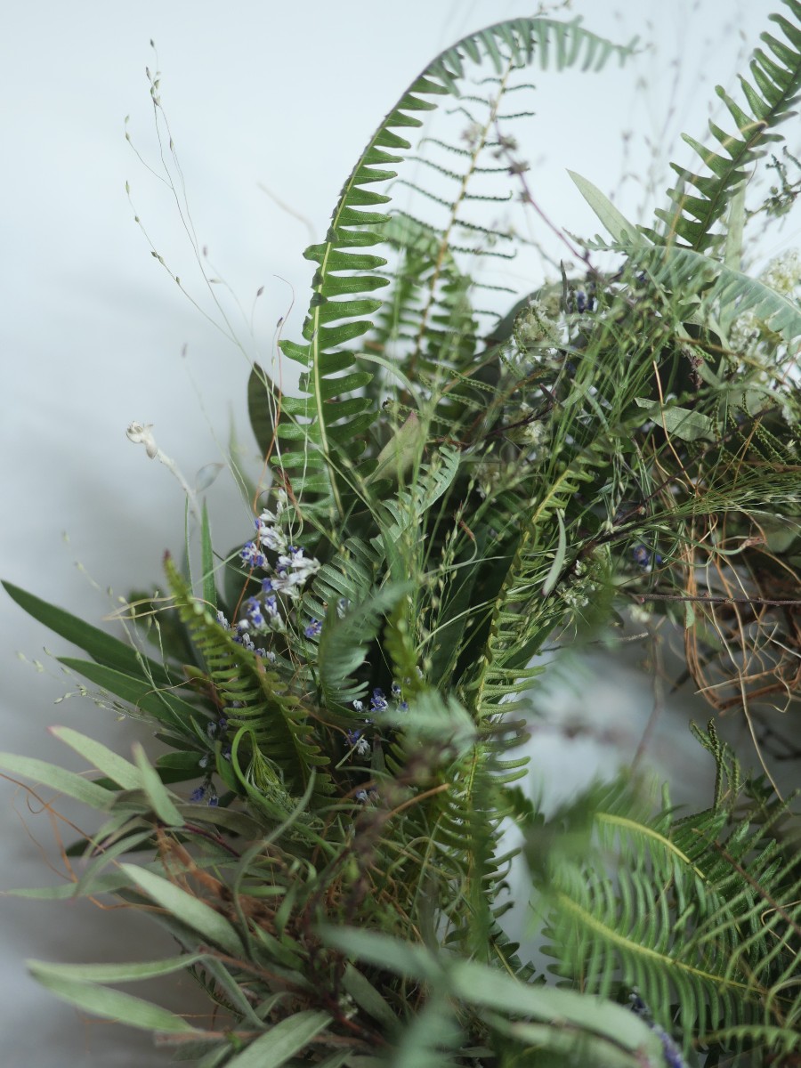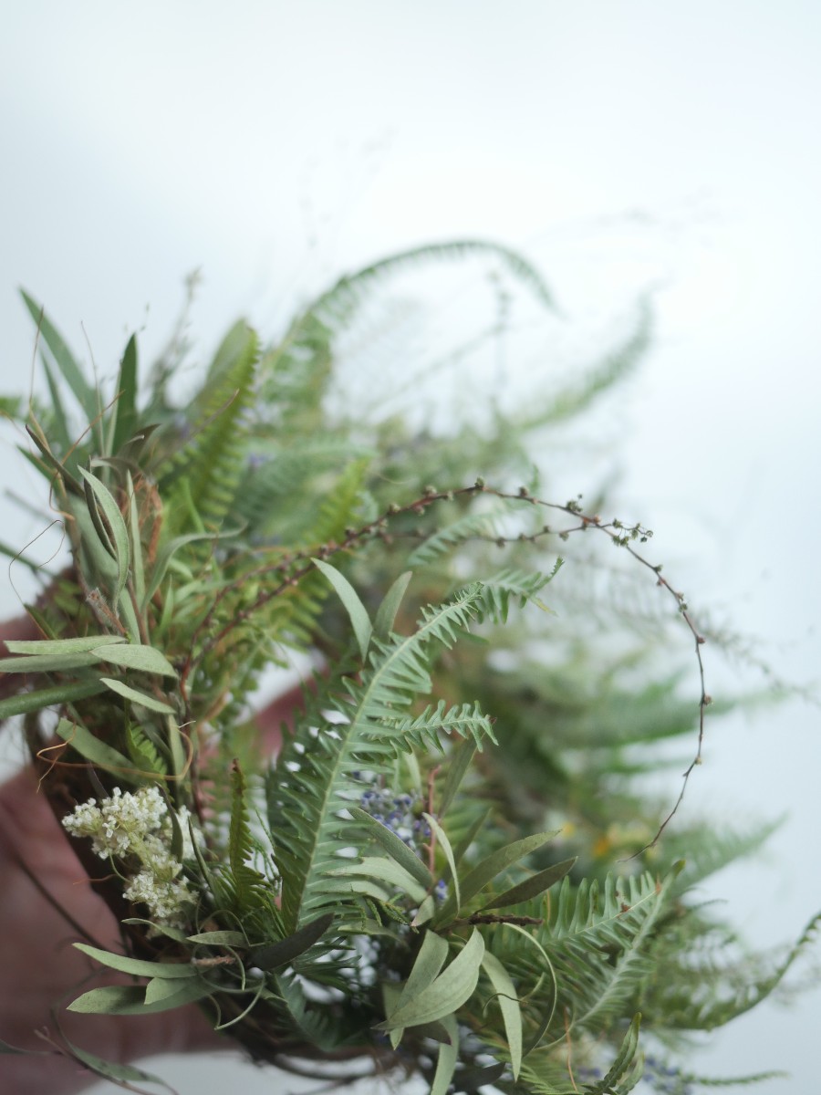 シダやユーカリなどのグリーンに野に咲く小さな花をイメージして春の花をひっそり忍ばせました