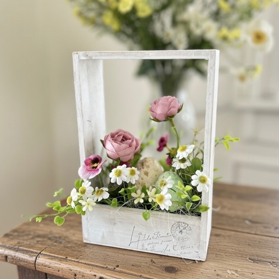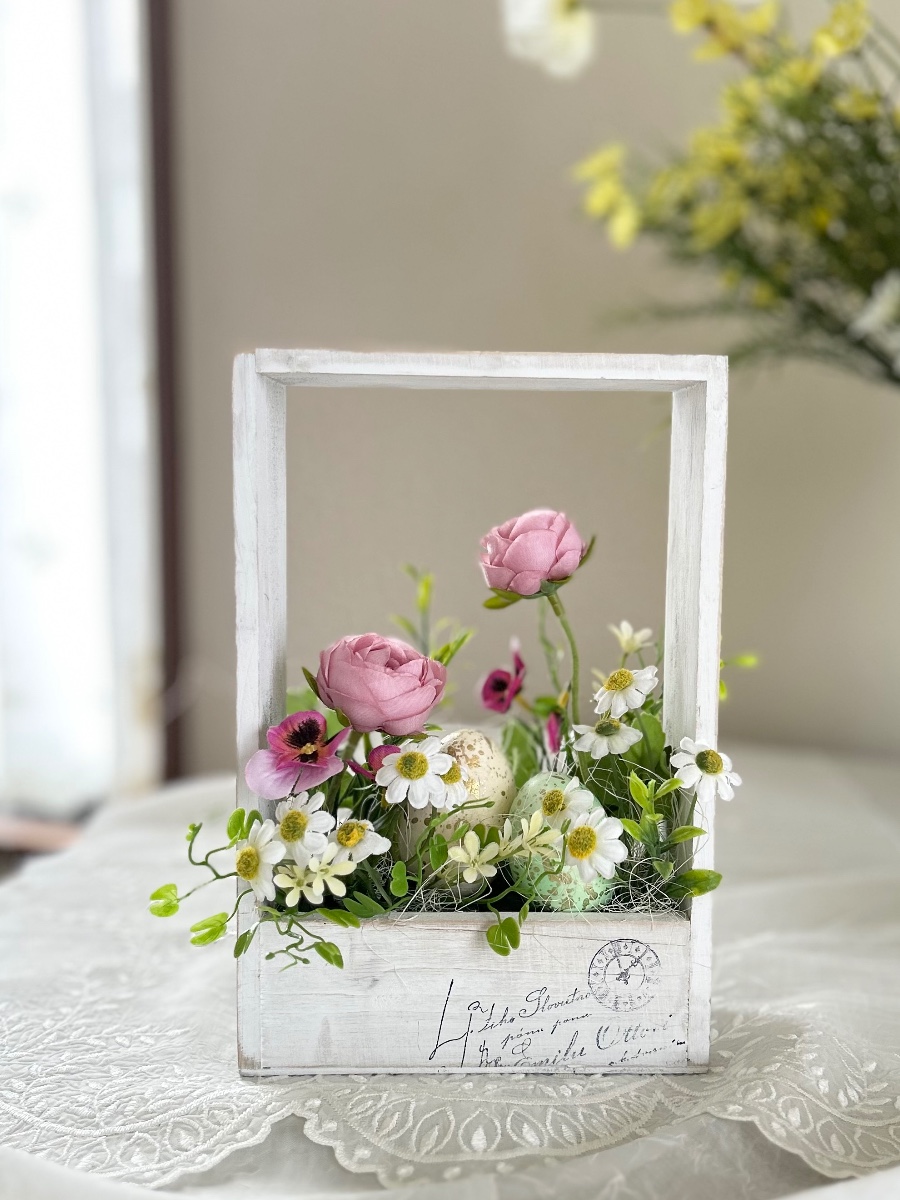 パステルカラーのeggを囲むように春のお花を咲かせました。白い木箱が明るくフレッシュな春を感じさせてくれます。