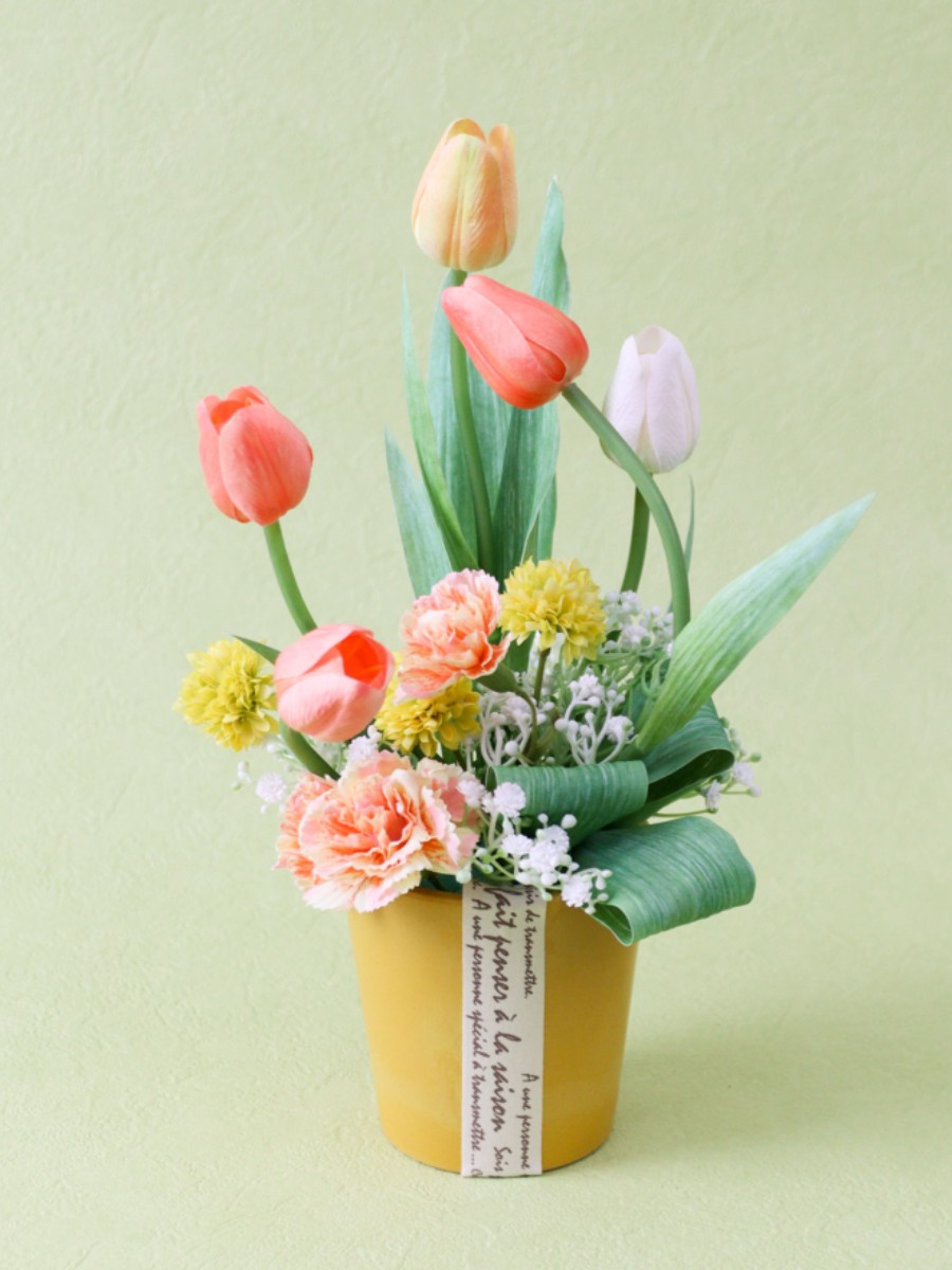 明るくやさしい色合いのチューリップを主役にした、春らしいフラワーアレンジメント。