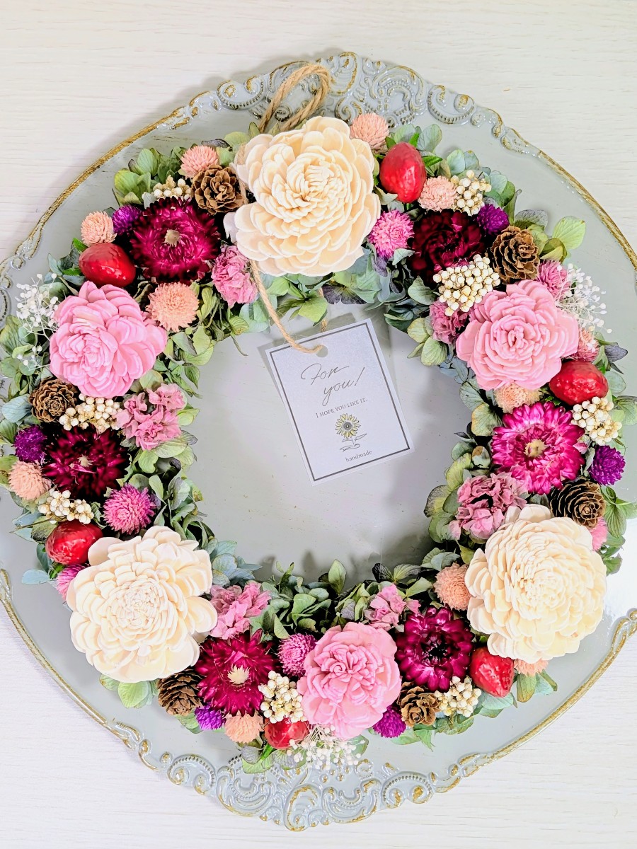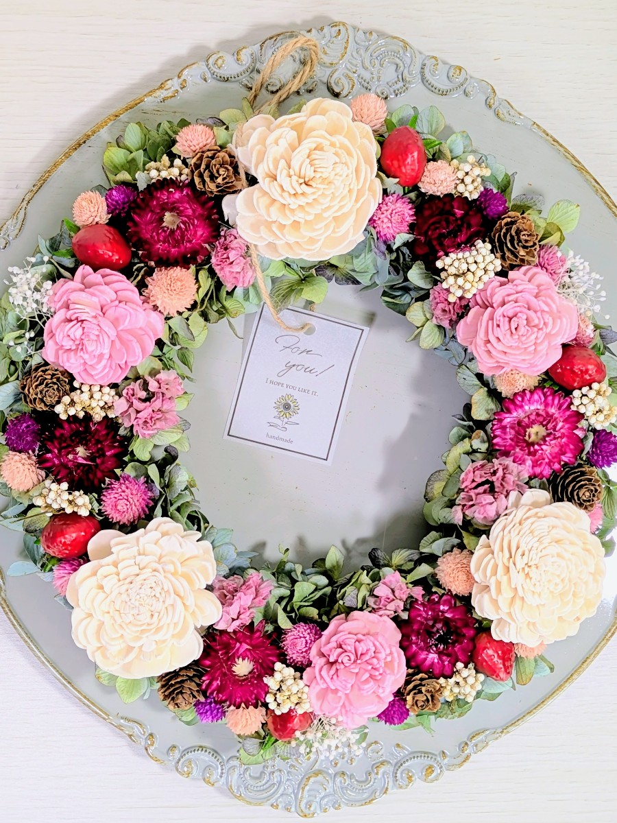 ドライフラワーローズと紫陽花のストロベリーリースです。春らしいピンクのお花とストロベリーが可愛いです。