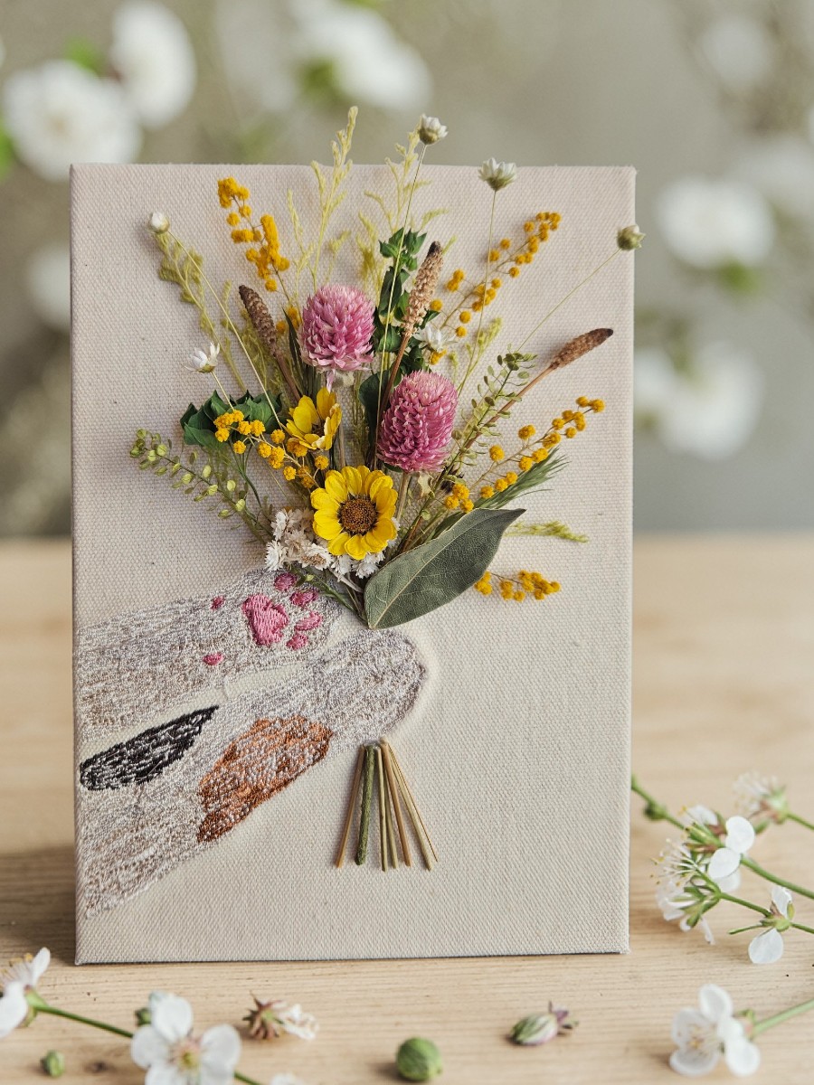 ネコの手が刺繍されたボードに春の小花をあしらったアレンジメントです。