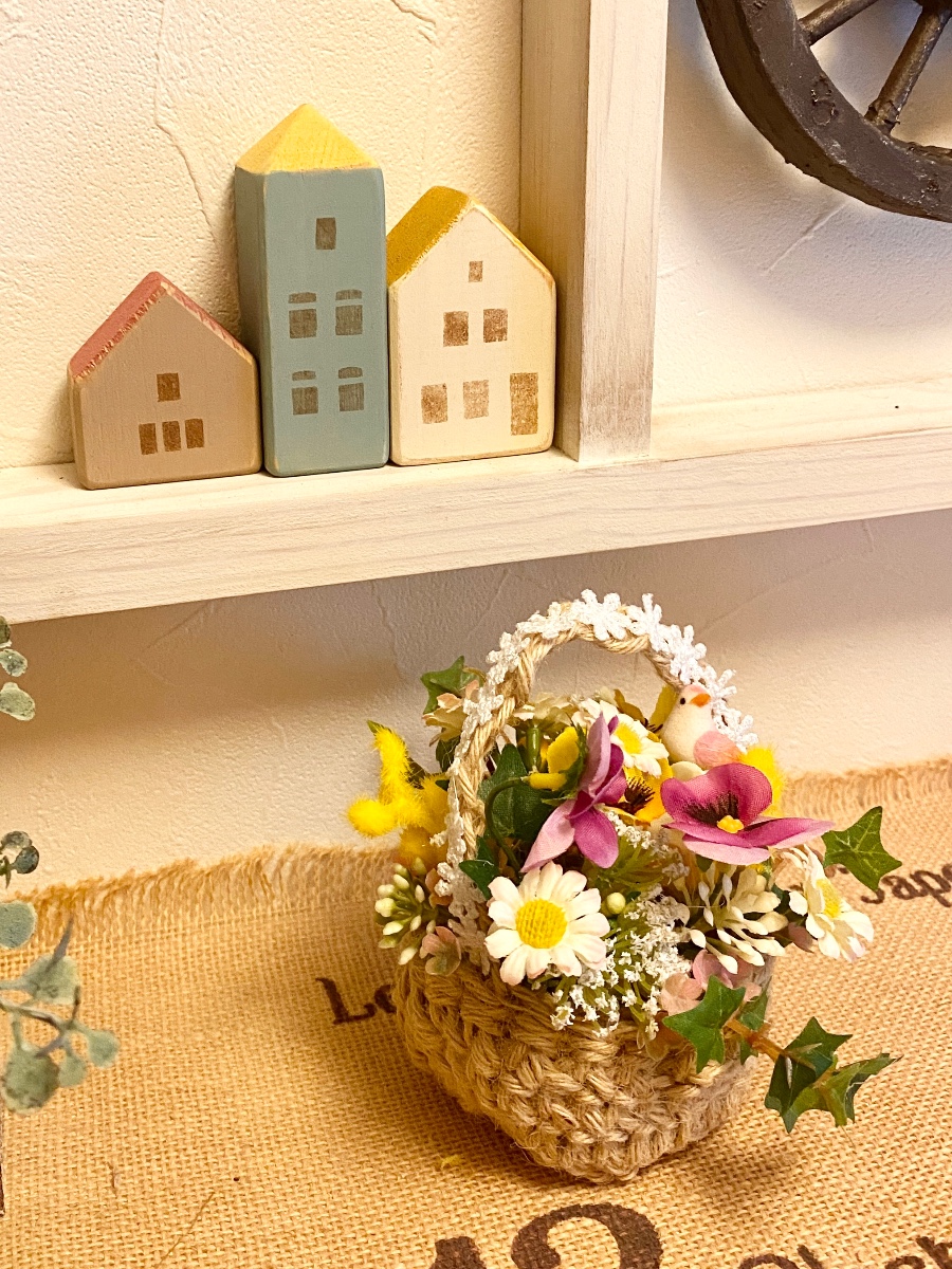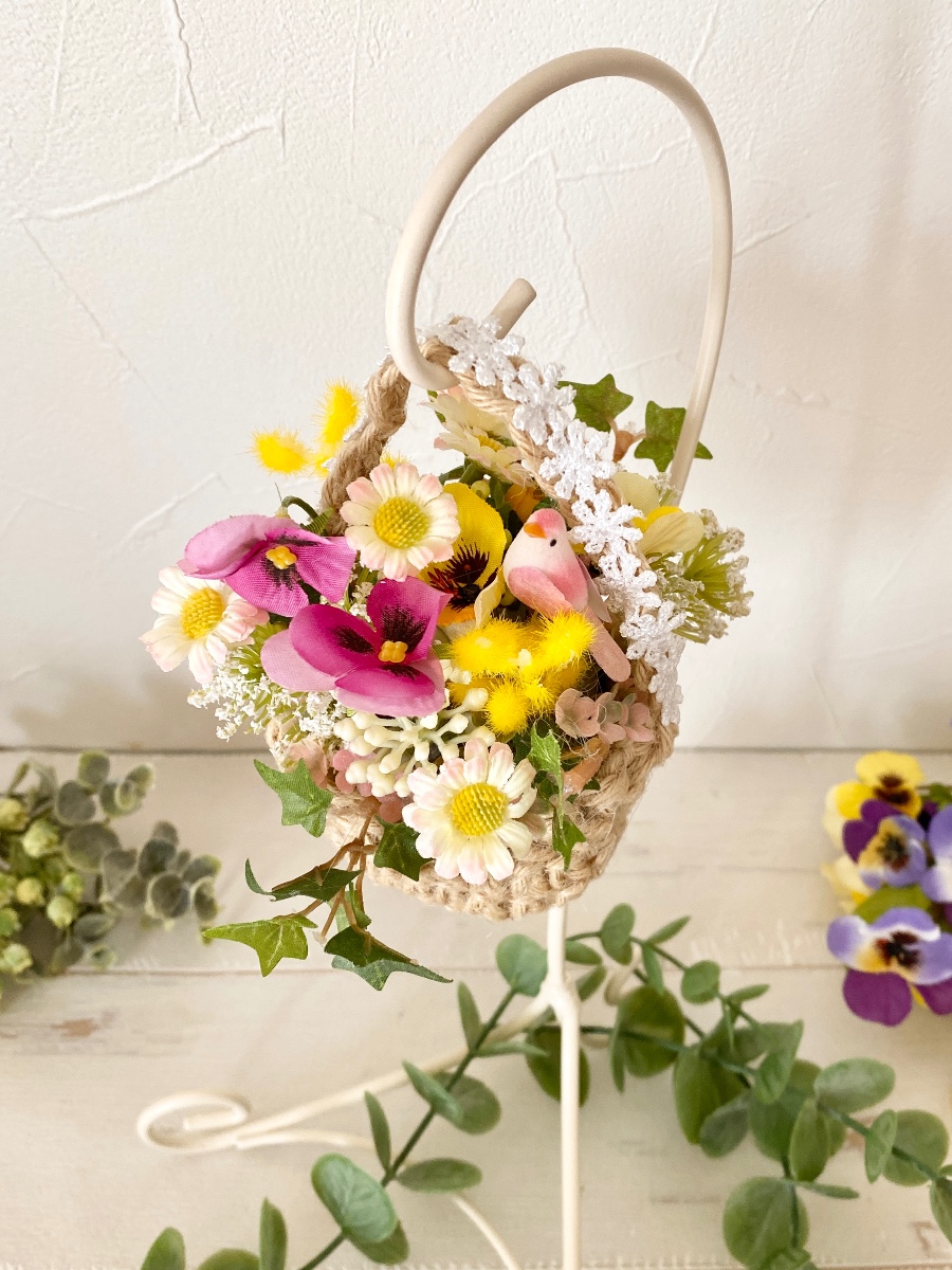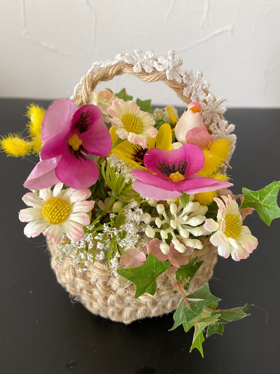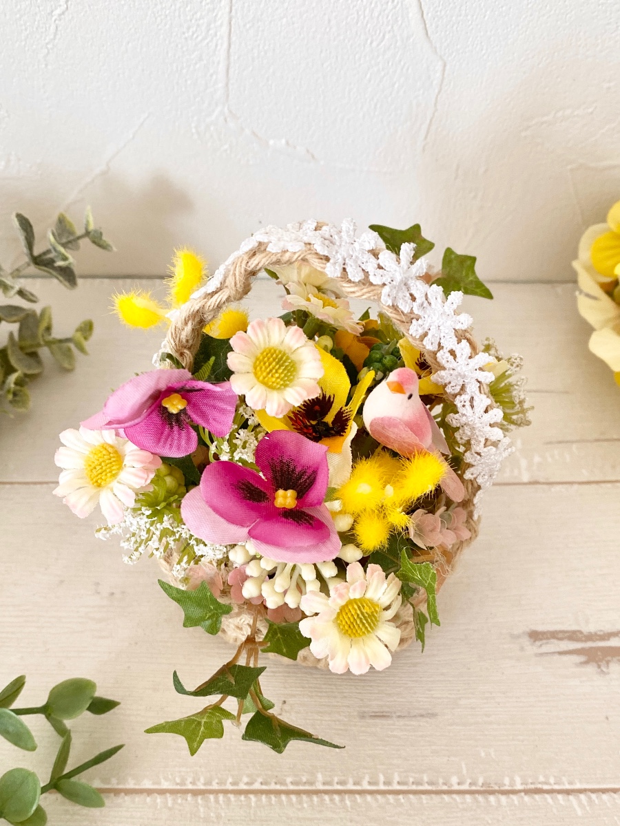 麻紐で編んだミニバスケットにパンジーやミモザなどの小花にグリーンや小鳥のピックを添えた春インテリアです。