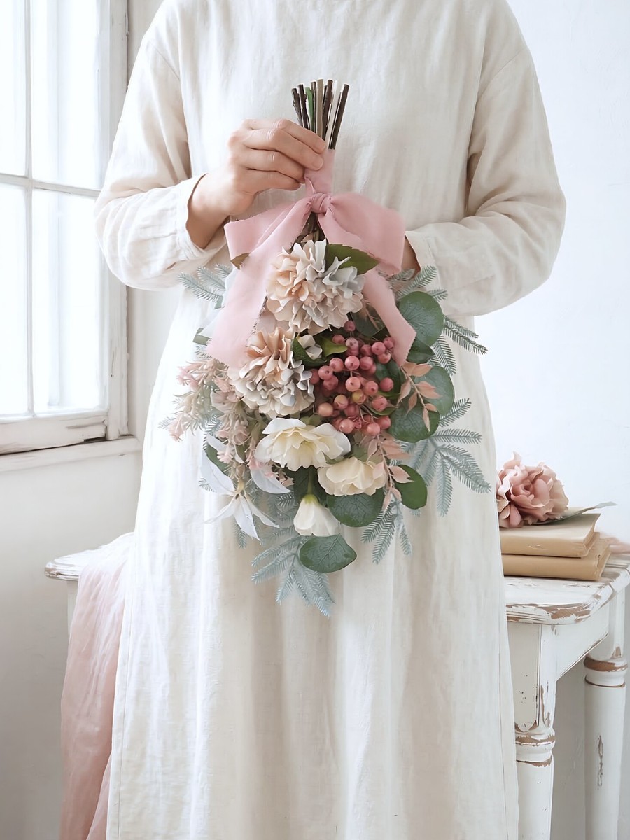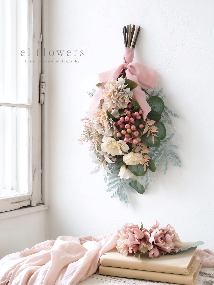 ブルーグレーとベージュのグラデーションが美しいダリアと、清楚なアネモネを主役に、くすんだベリーやユーカリをたっぷりと合わせたニュアンスカラーのスワッグです。