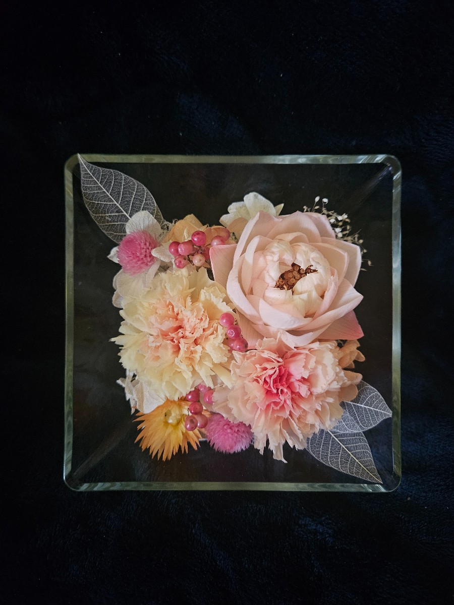 スクエアのガラス花器にハスのお花をはじめとしたプリザーブドフラワーをアレンジしました。