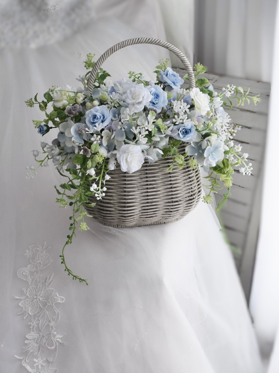 シックなホワイト系のバスケットに小ぶりなバラとスズランや小花を詰め込んだバスケットブーケ。