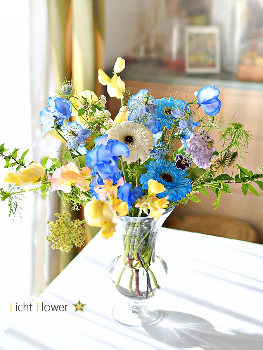 染めのスイトピーとガーベラをメインに、軽やかな素材は花器の側面を使って拡がるように生けました。