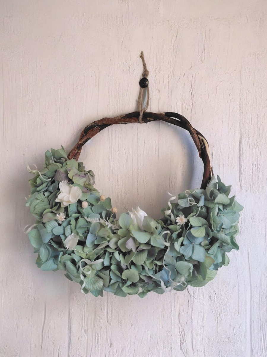 ブルーグリーンのドライ紫陽花と、小さな白い花々で作った花籠風のリースです。