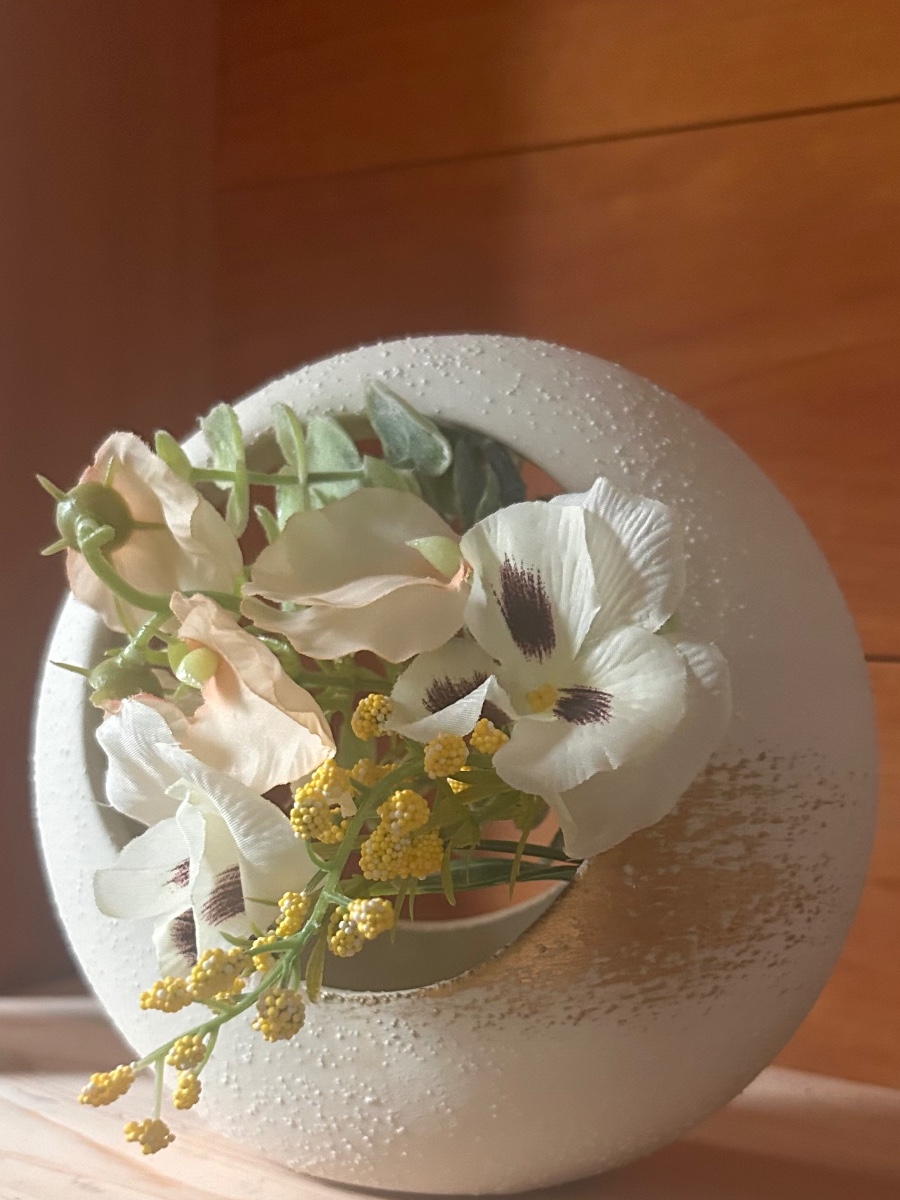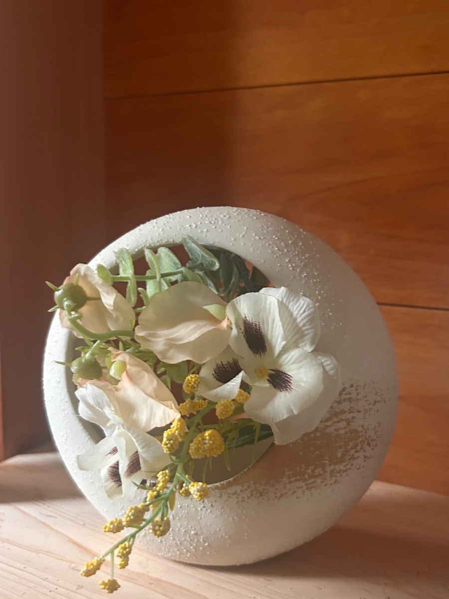 和風のまんまる花器に優しいピーチカラーのスイトピーなど春らしいお花を飾りました。