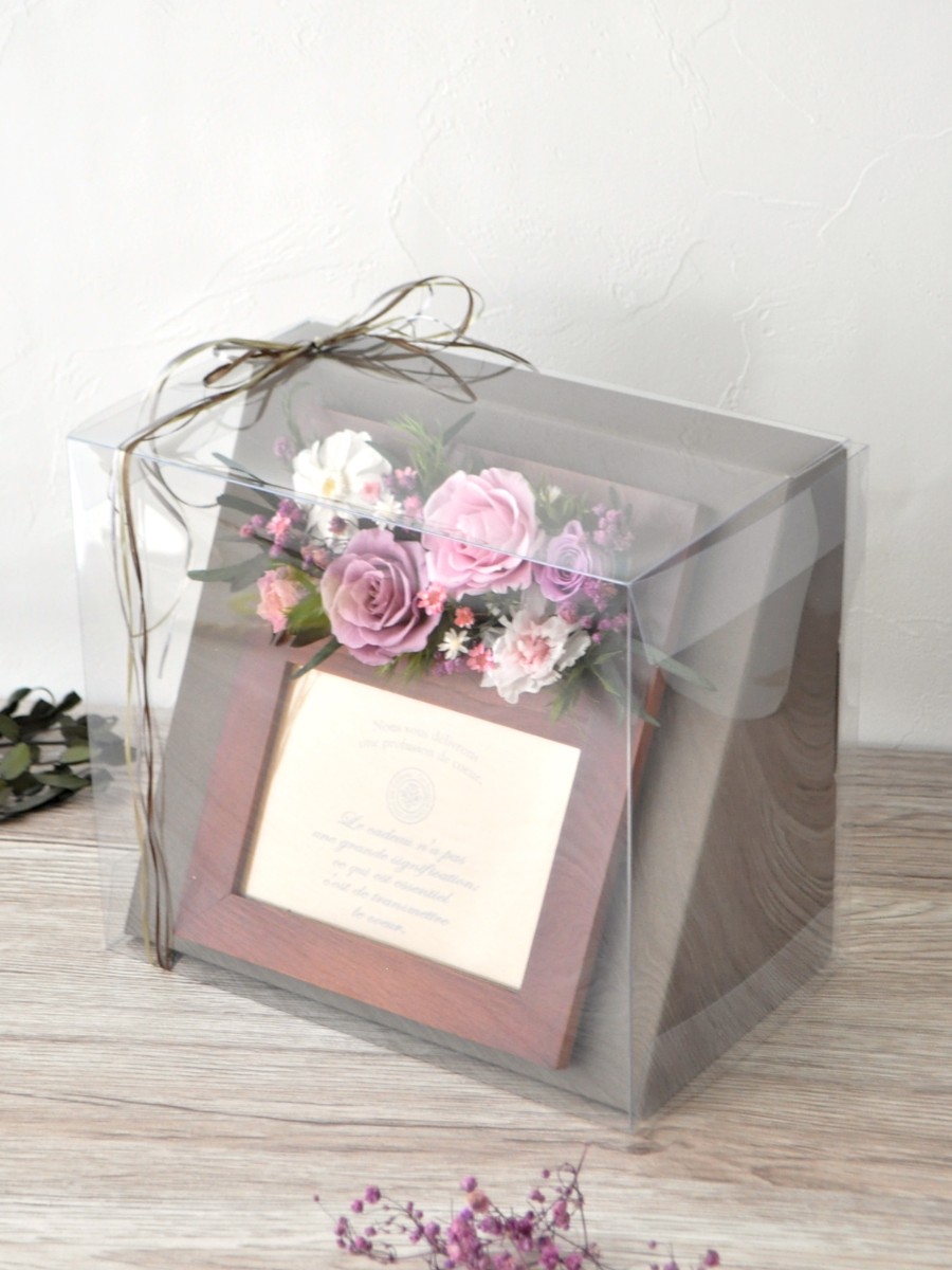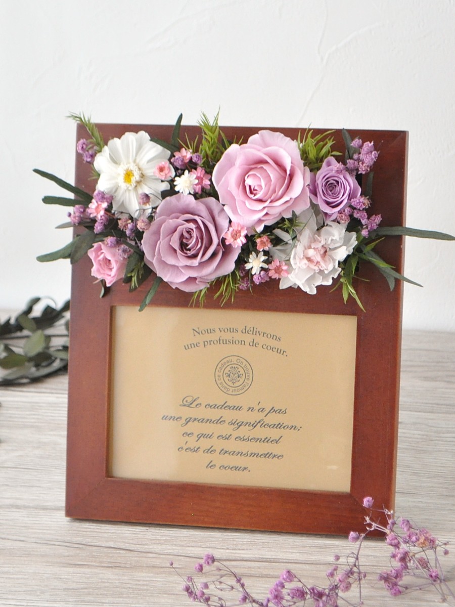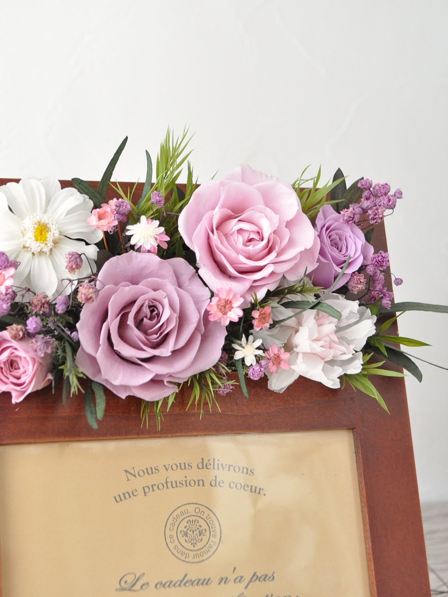 ブラウンのシックなウッドフォトスタンドに、お庭を切り取ったようなナチュラルにプリザローズでアレンジしました。