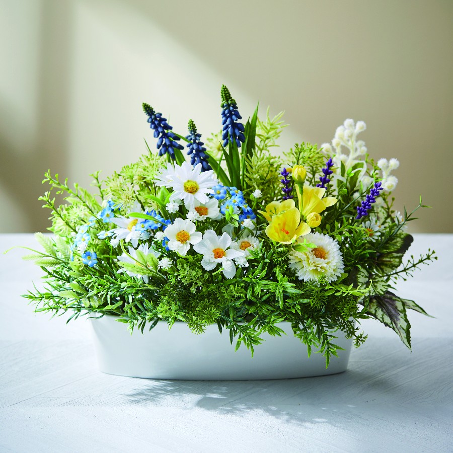 愛らしい小花のミックスフラワーバンチとミックスリーフバンチにムスカリを組み合わせて、寄せ植え風に仕立てたアレンジです。横長のベースに浅めにさして春の野原の雰囲気に。