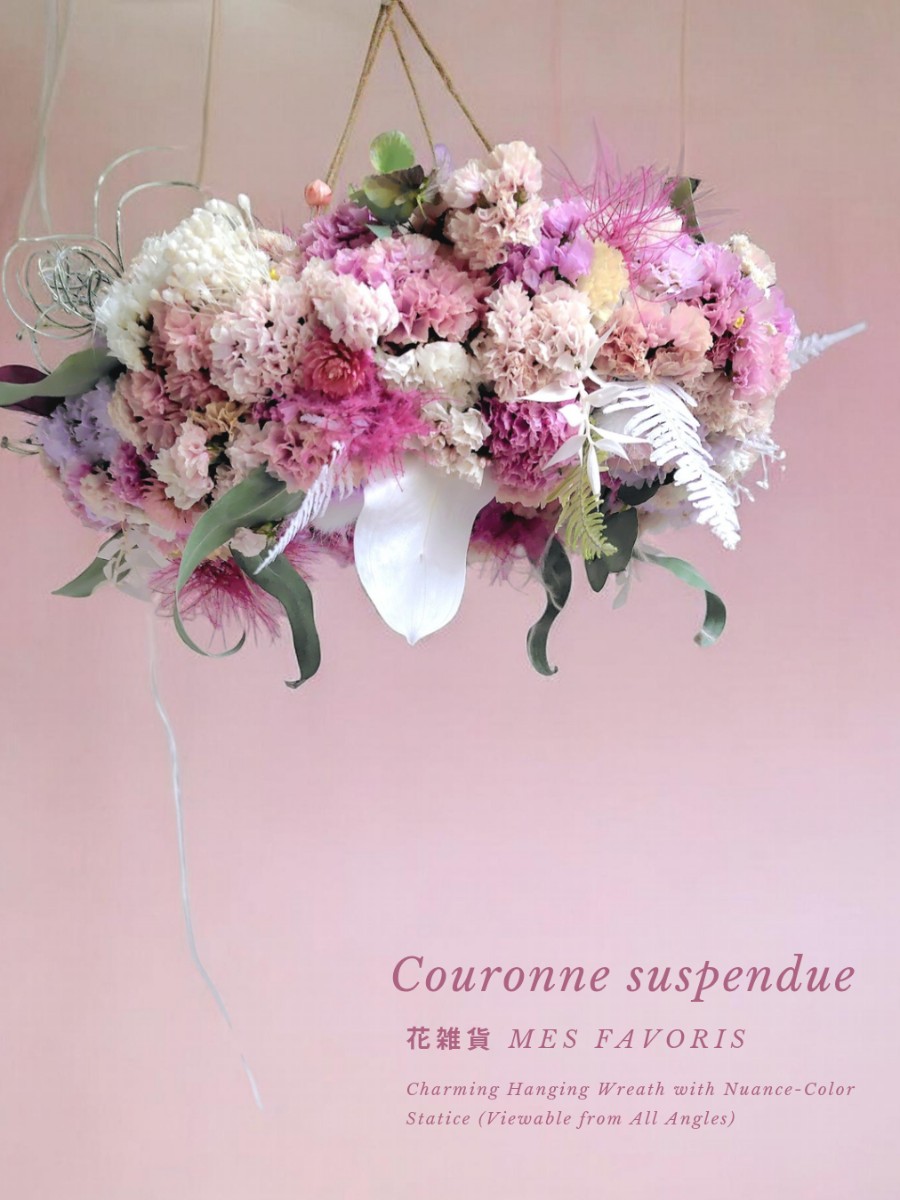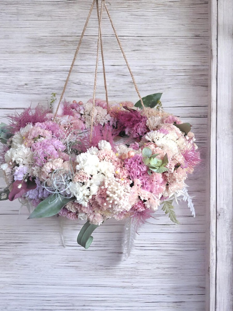 たくさんの種類のニュアンスカラーのスターチスと小さな花々で作った、フライングリースです。