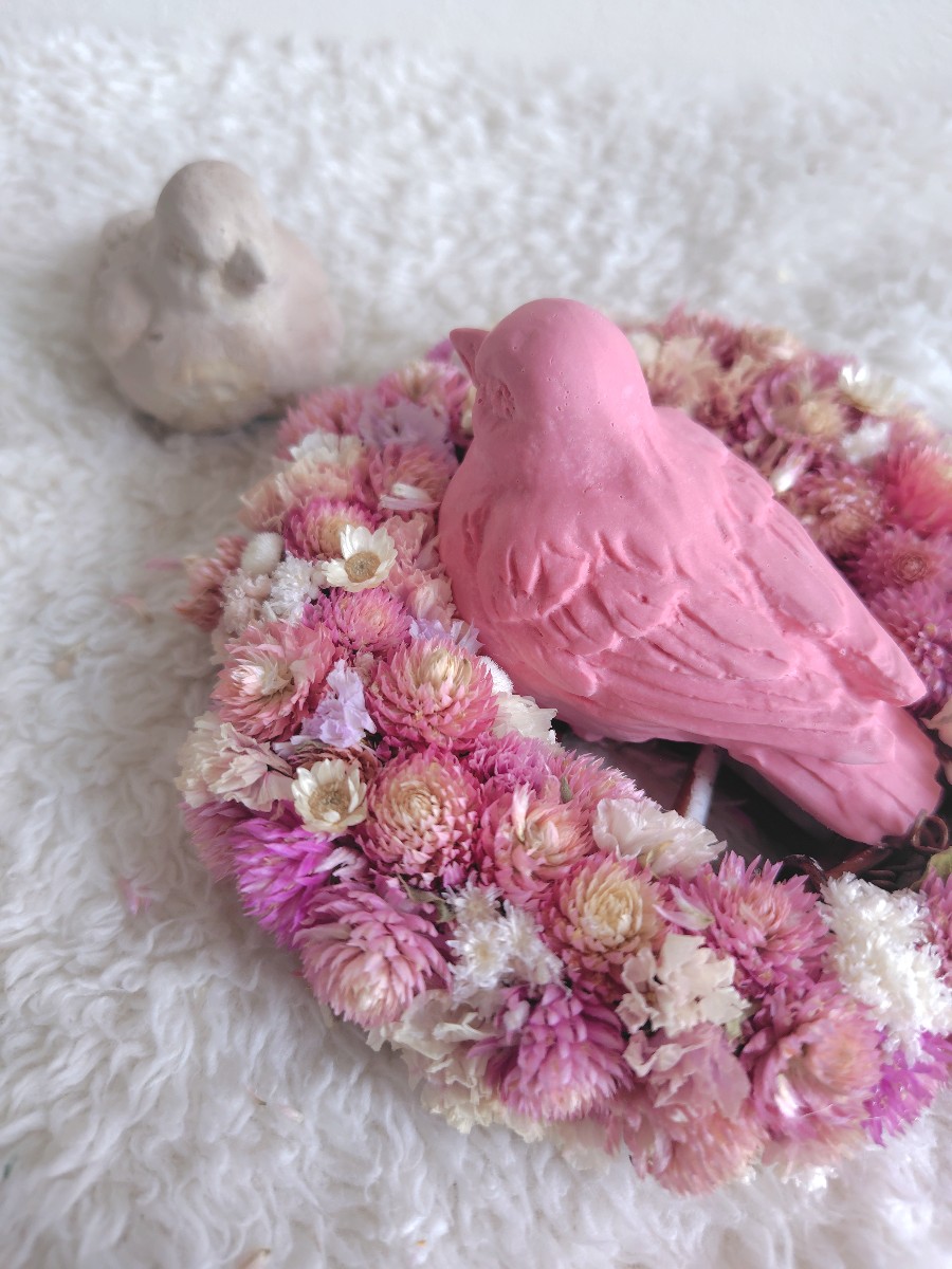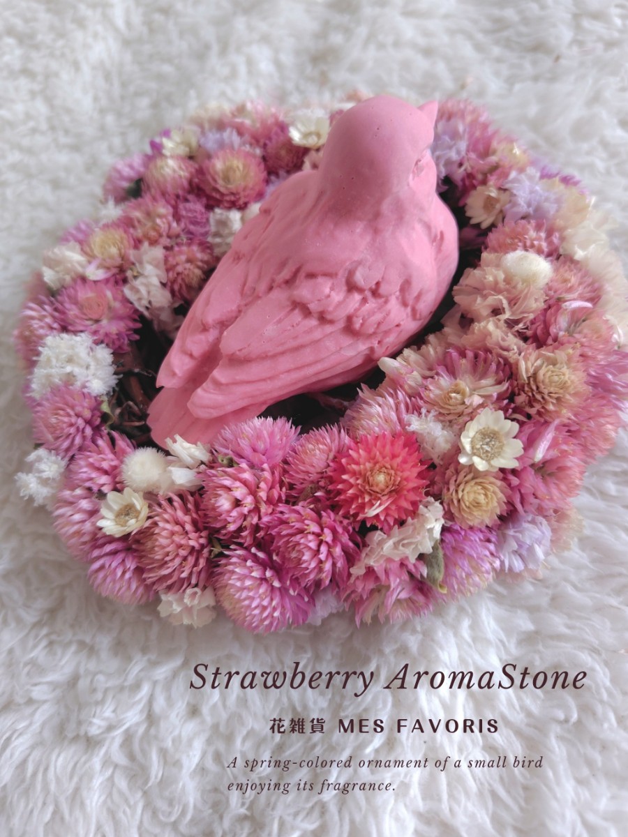 鳥の巣に模した小さなリースに、ストロベリー香る小鳥のアロマストーンを載せました。