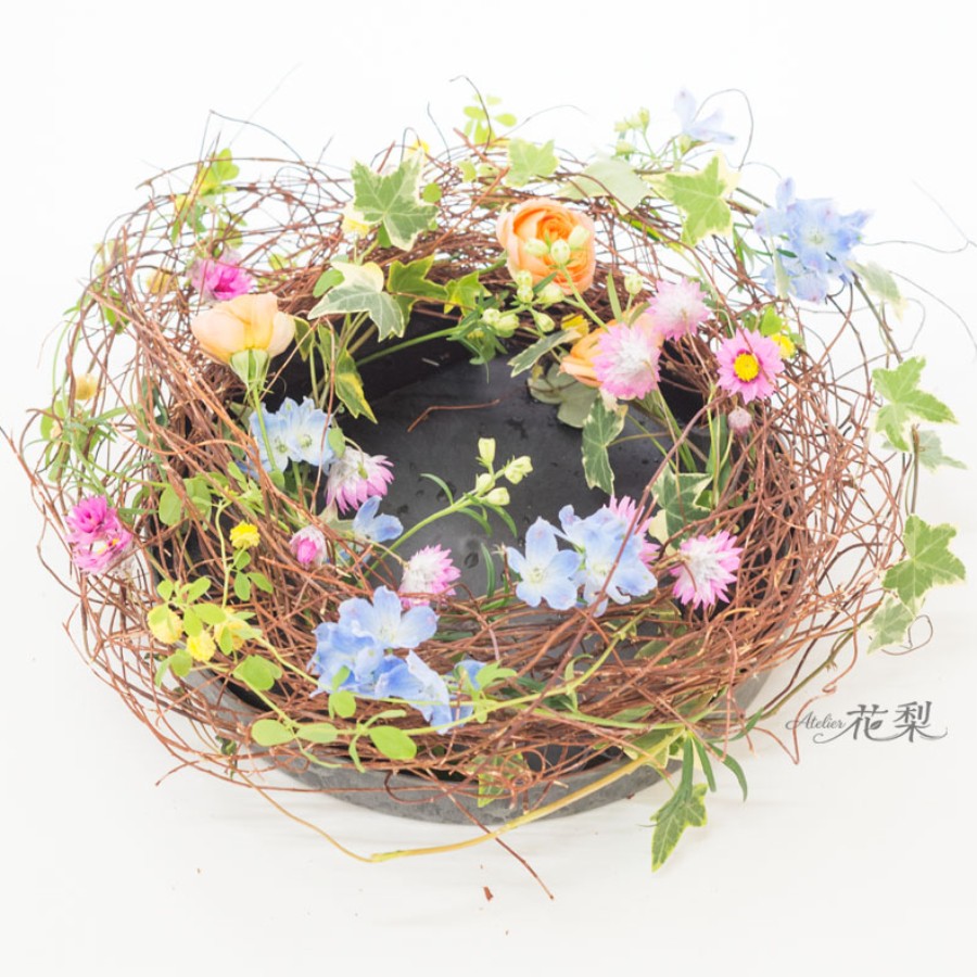 冬枯れしたワイヤープランツの蔓を鳥の巣のように絡め、カラフルなお花をあしらいました。