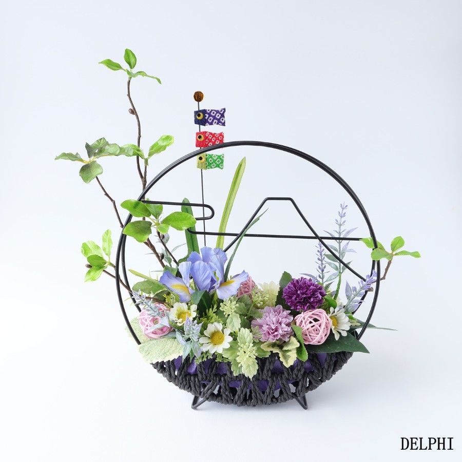 アーティフィシャルフラワーのドウダンツツジやアイリス、ポンポンマム(菊)などを使用した和風アレンジメントです。