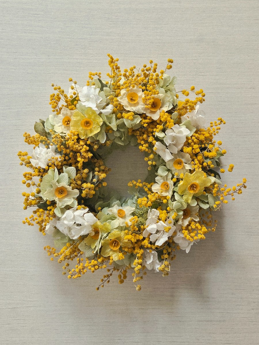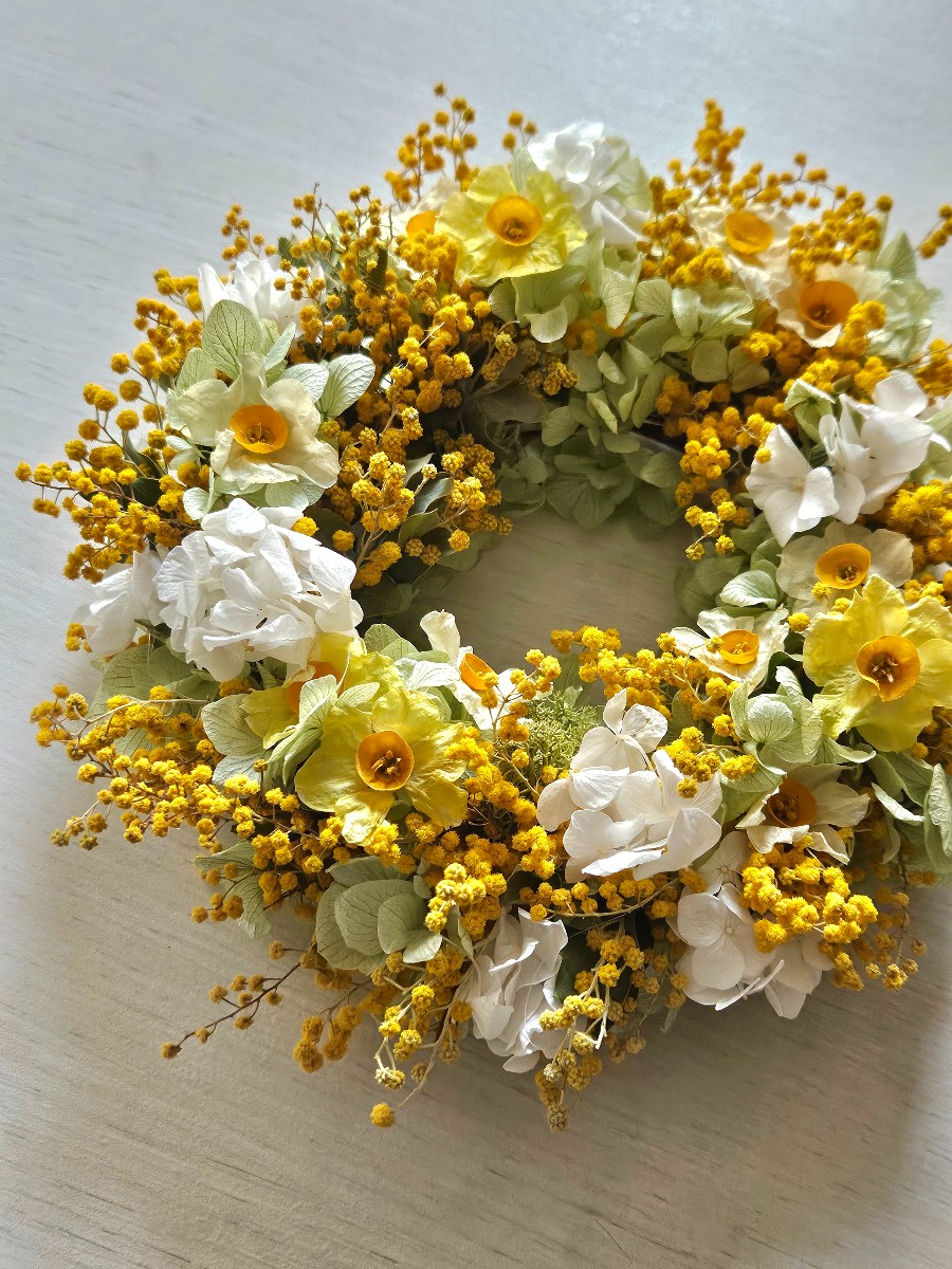 春を告げるスイセンと春を盛り上げてくれるミモザのお花をあしらったドライリースです。