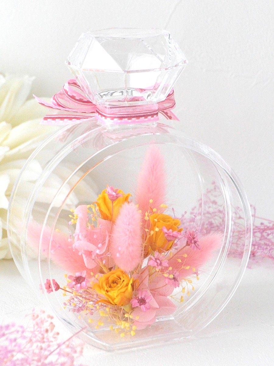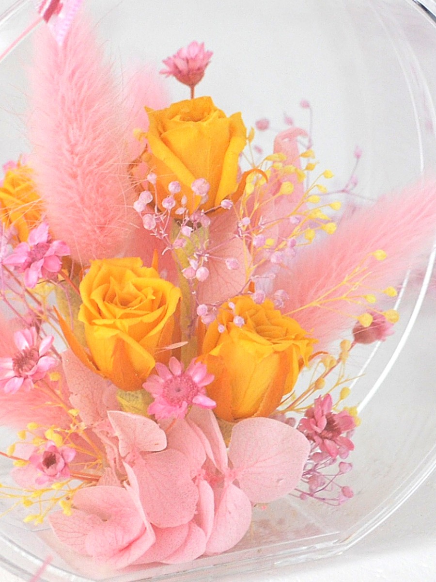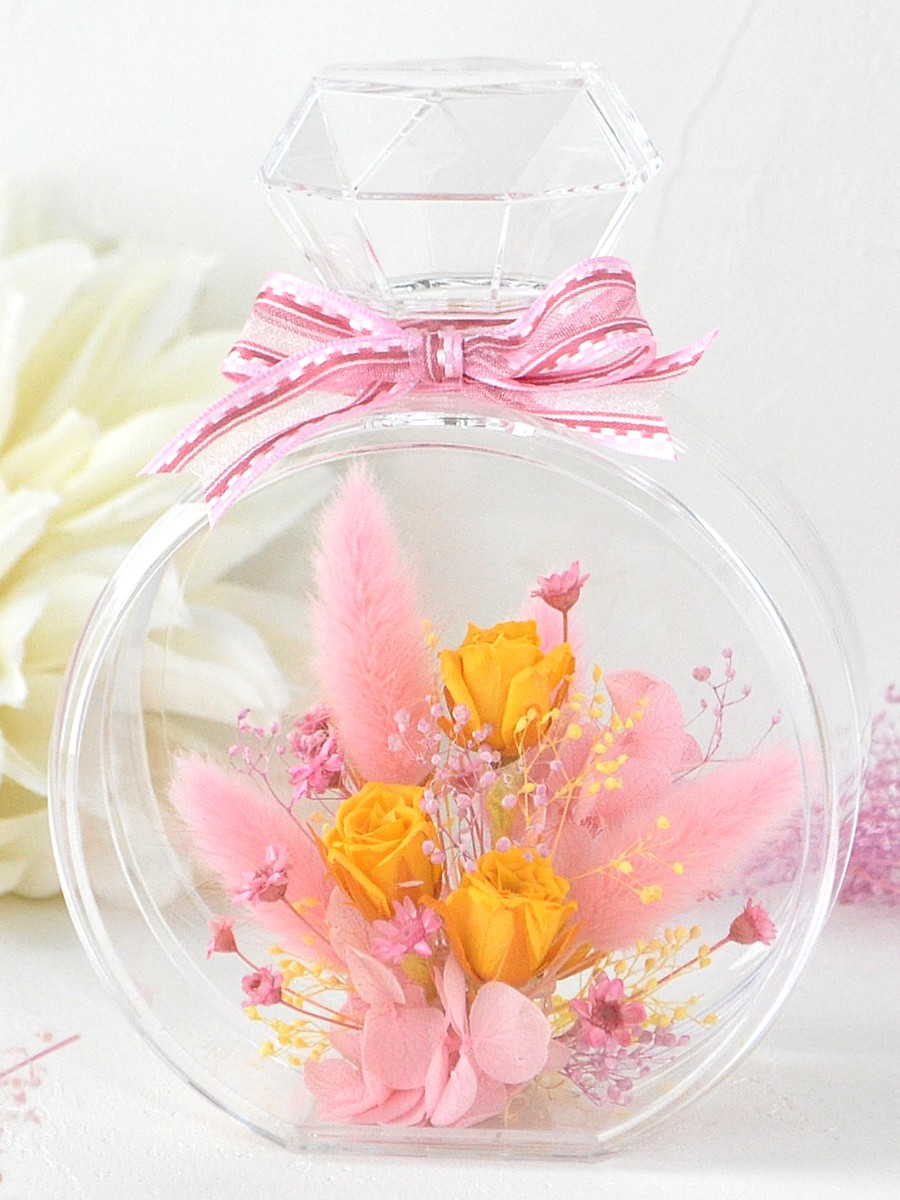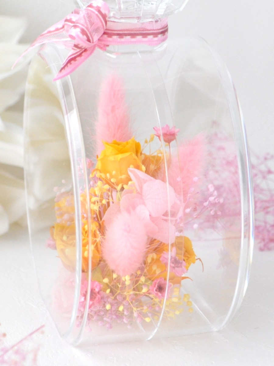 プロフーモ・ミオに甘い色合いの花畑を切り取ったようなプリザーブドのアレンジを作りました。
