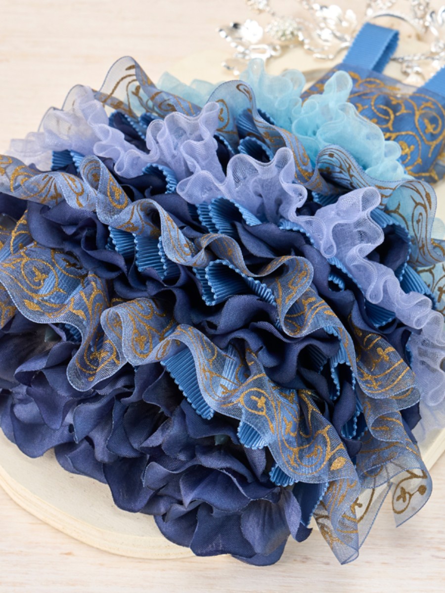 オーガンジーリボンの上部に両面テープを貼り、ギャザーを寄せながら上に重ねるように付けます。