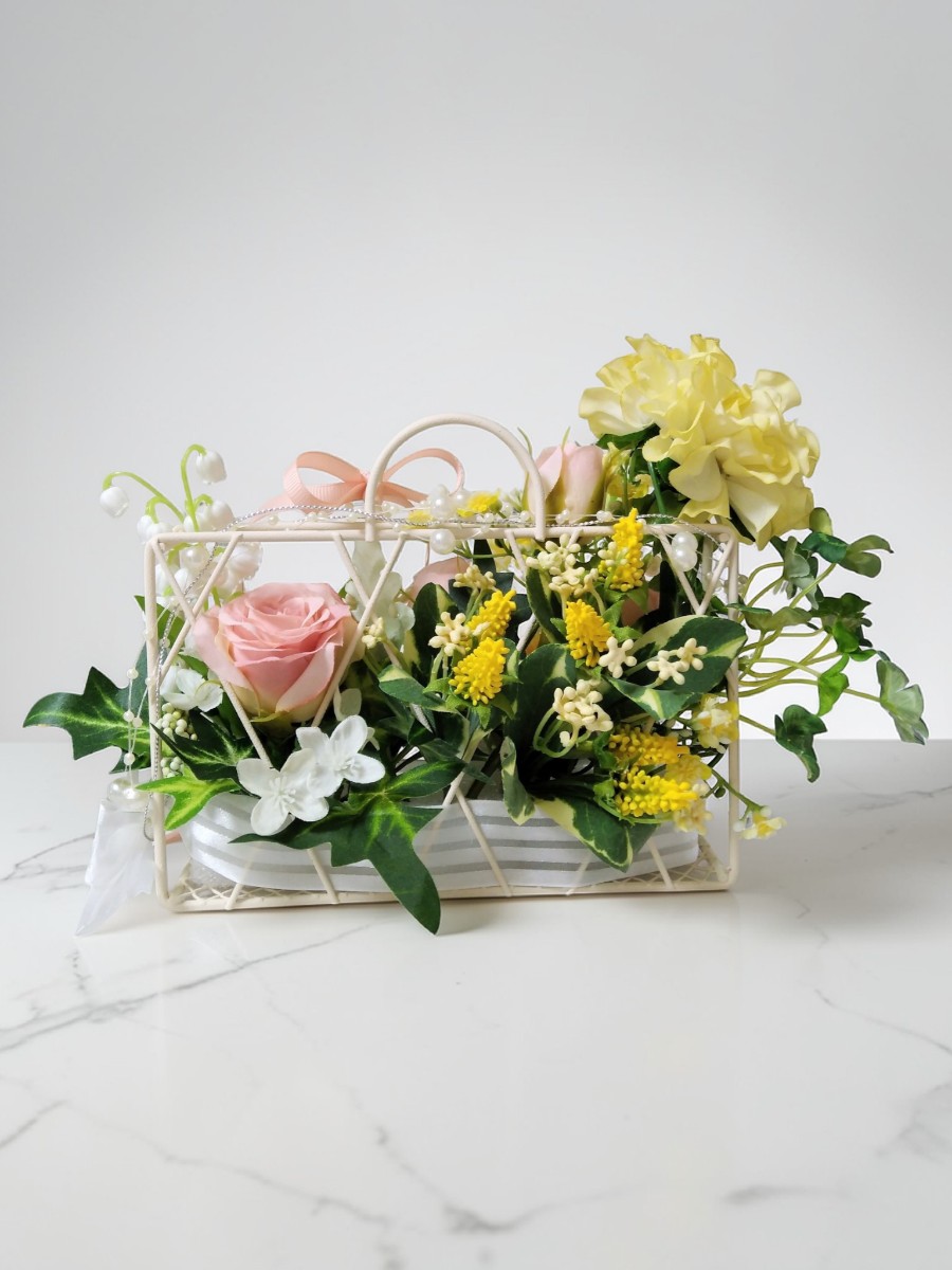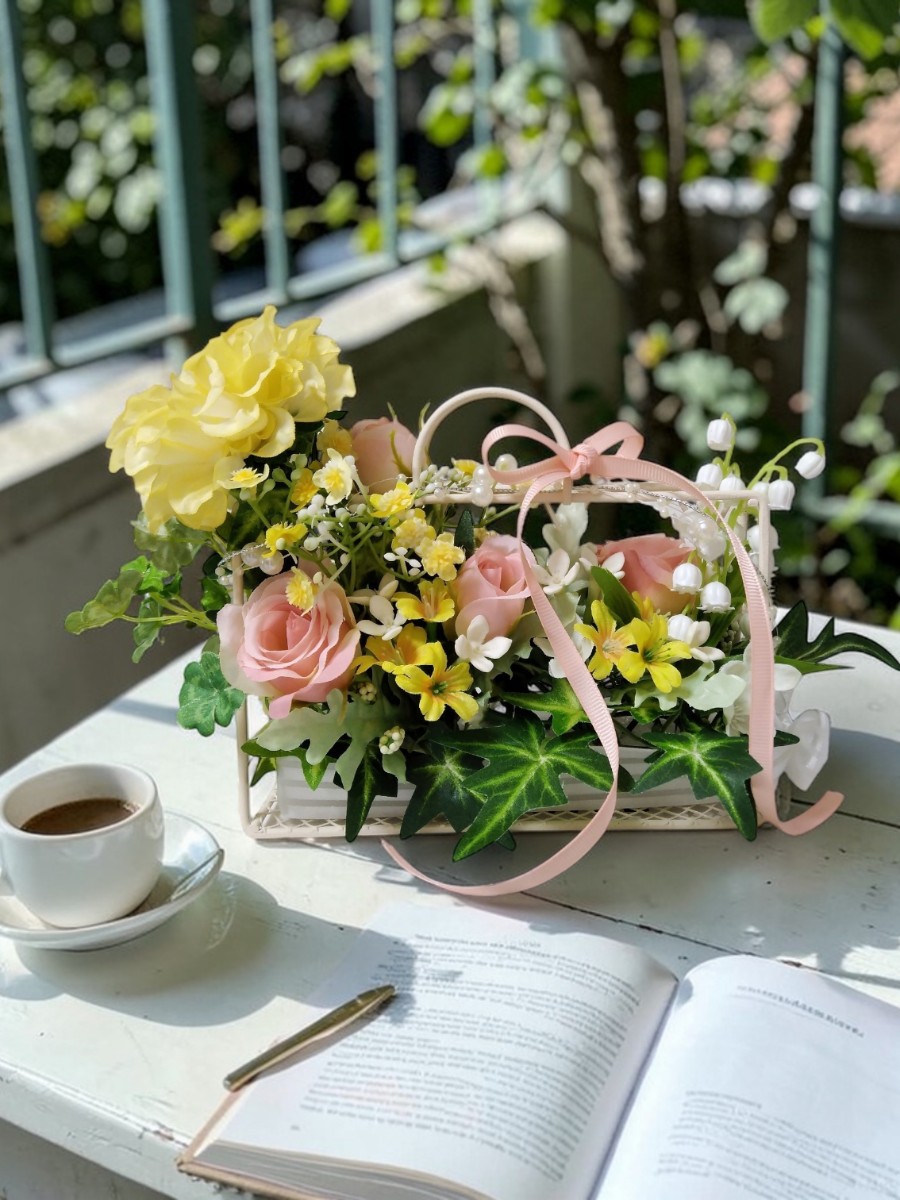 春の花に添えた四葉のクローバーがバックから溢れ出て、幸せいっぱいのお花のアレンジメントです。