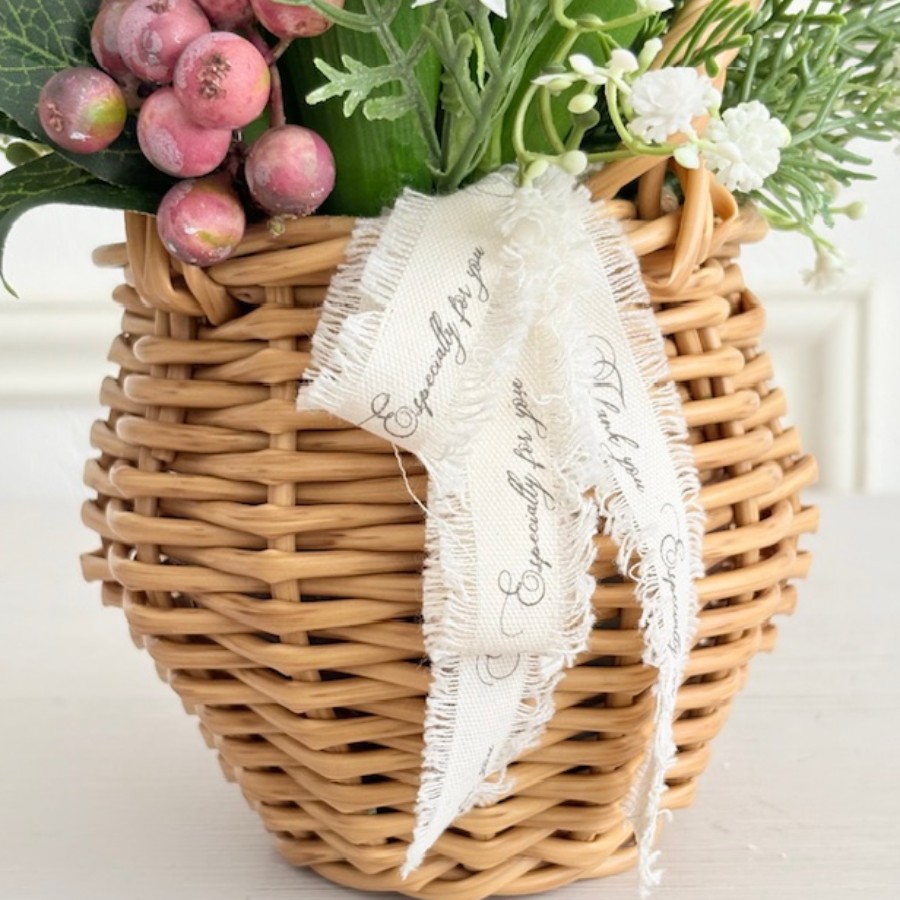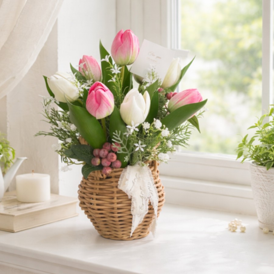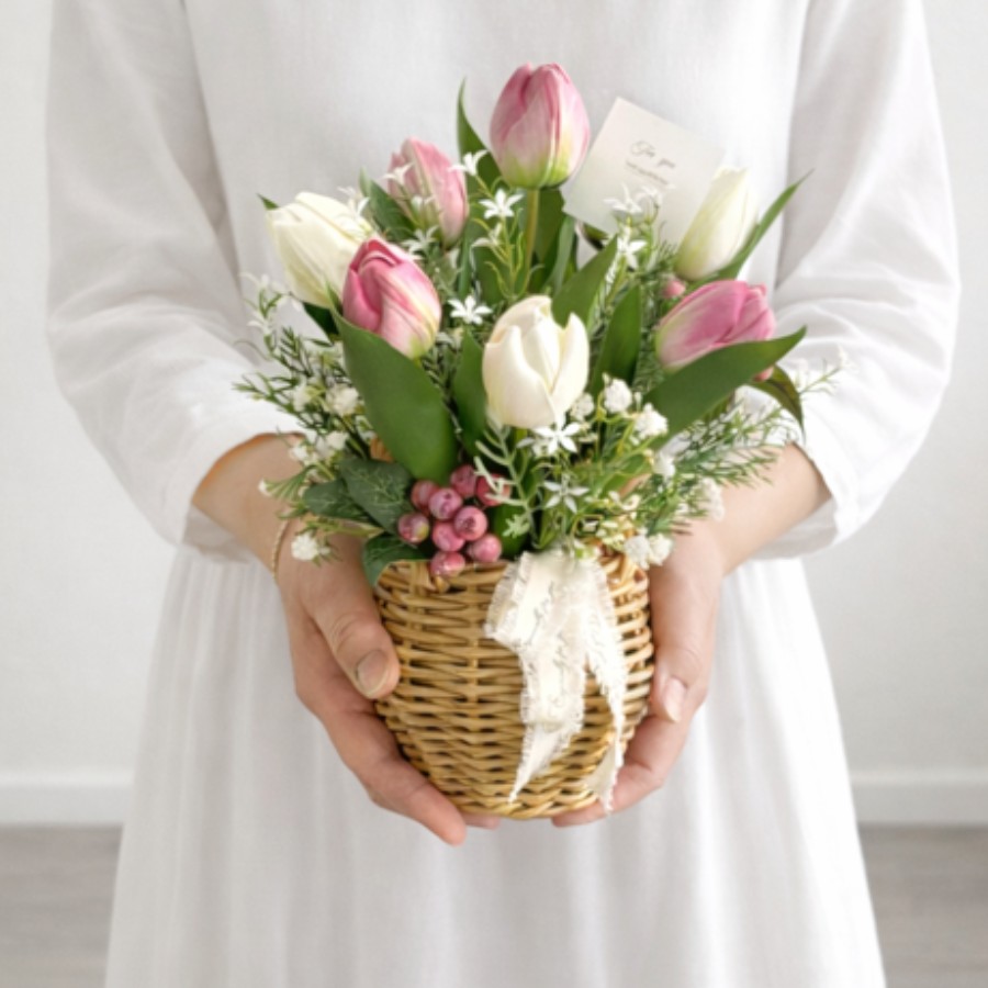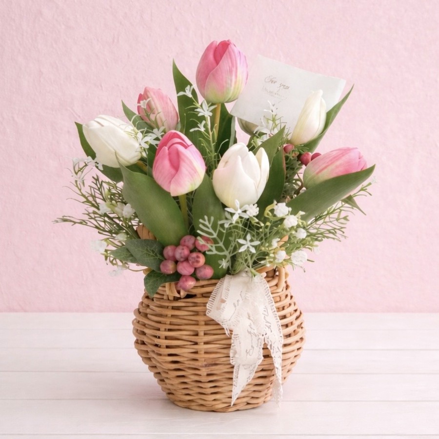 やわらかなピンクとホワイトのチューリップを、ナチュラルなバスケットにふんわりと束ねました。