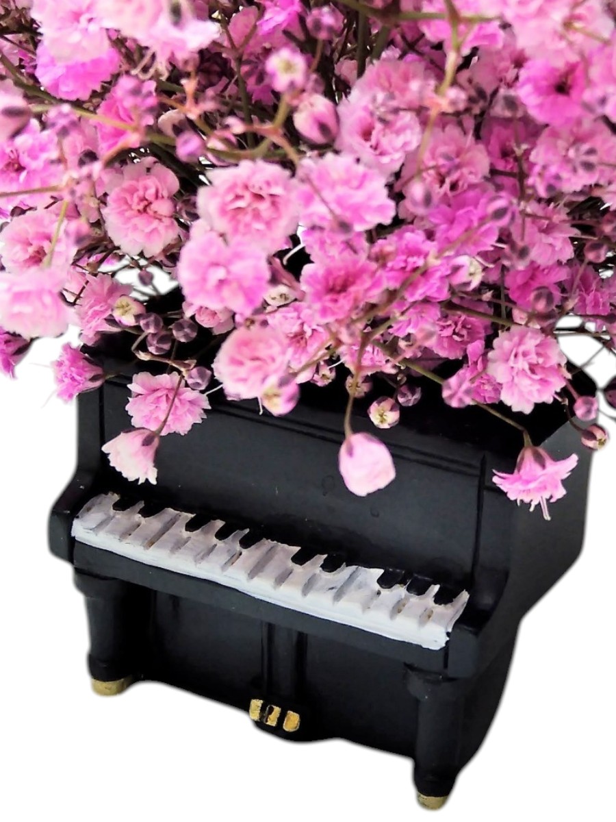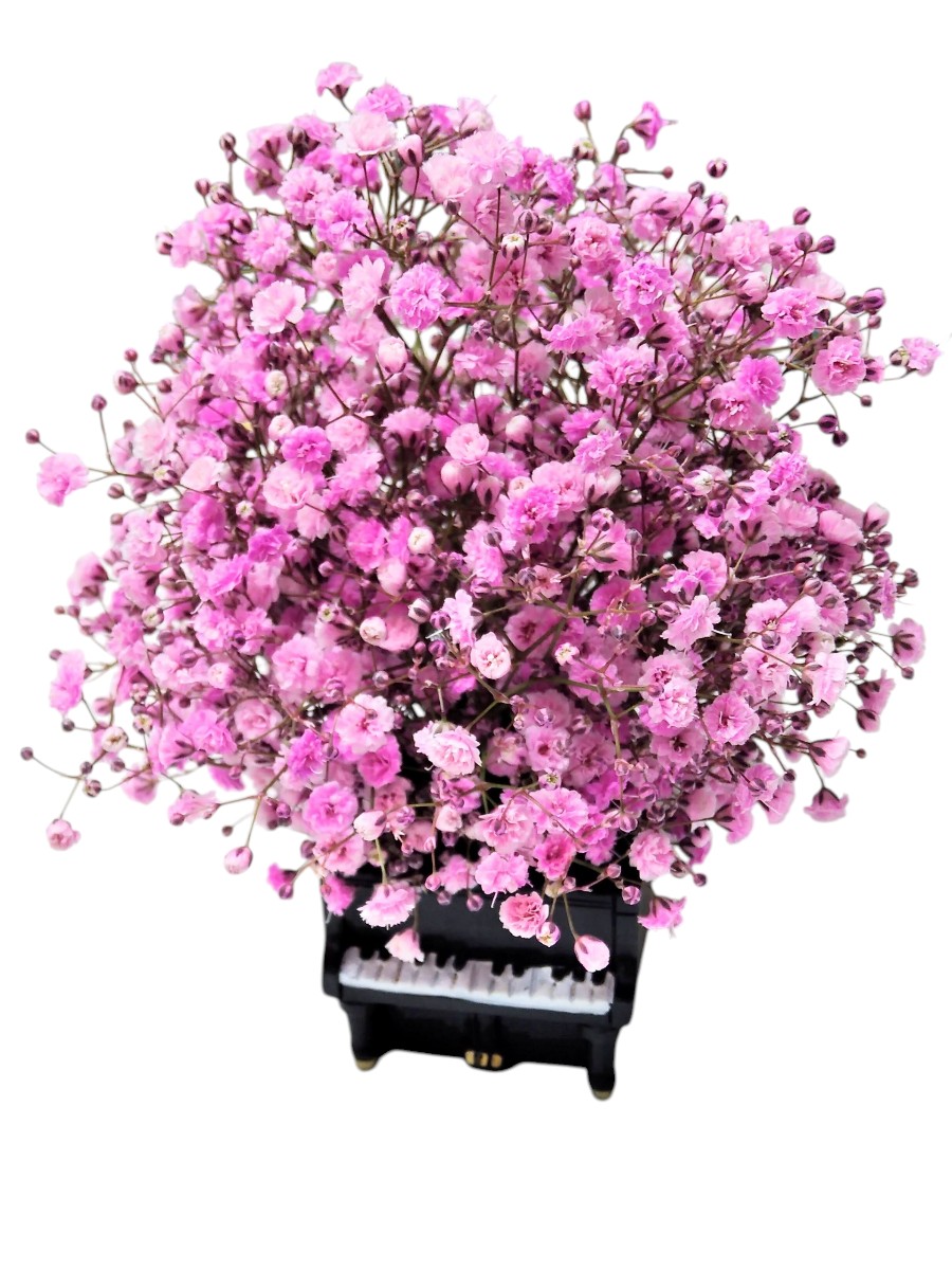 ピアノ型の小さな花器に、かすみ草の花束をアレンジメントしました。ピンク色で華やかなので、小さいながらも存在感があります。