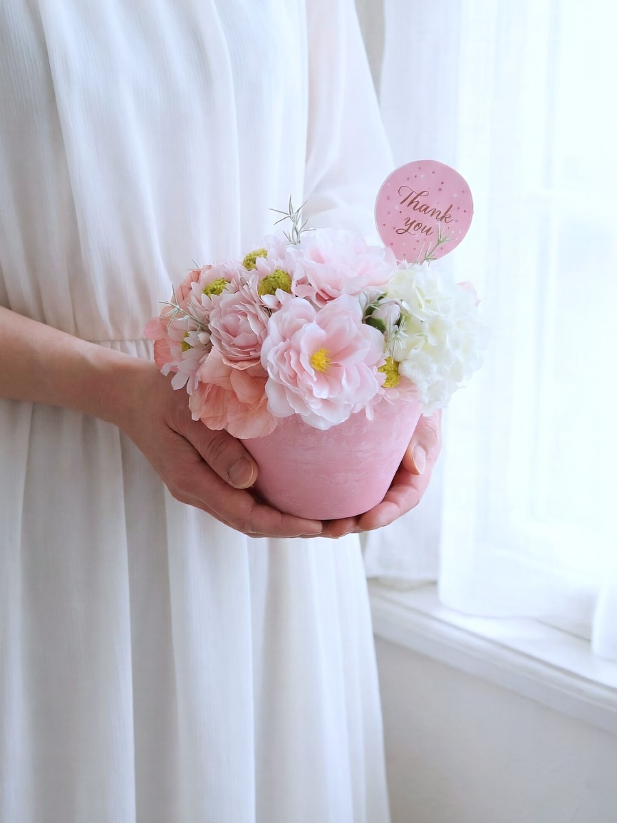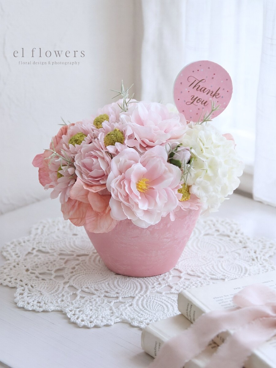 幾重にも重なる花びらが美しいピンクのガーデンローズに、コロンとした形が愛らしいスノーボールを合わせ、見ているだけで心が温かくなるような優しい色合いに仕上げました。