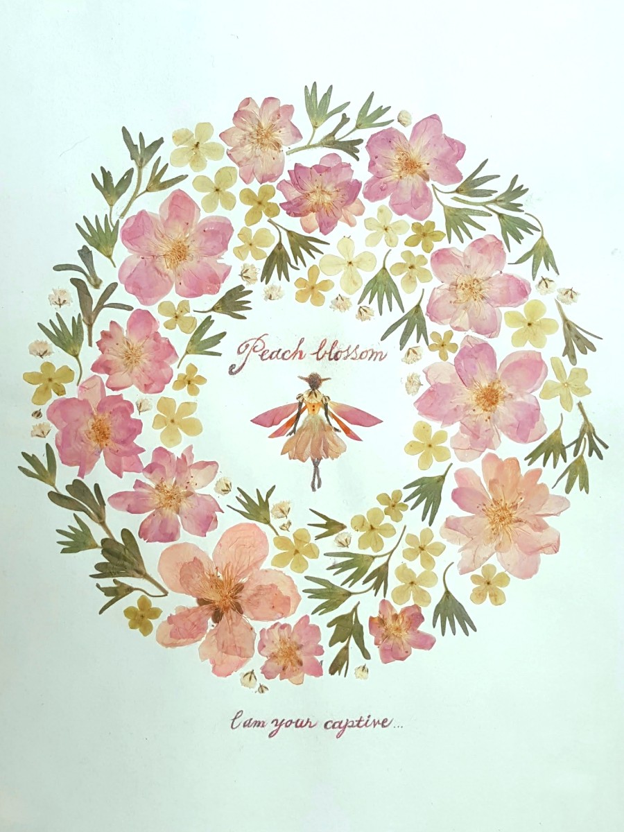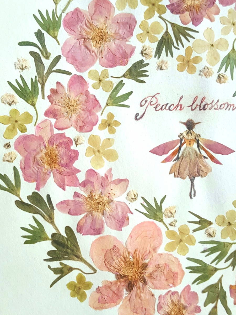モモの花、オオデマリ、カスミソウ、カリブラコアの萼を使用した押し花リースです。