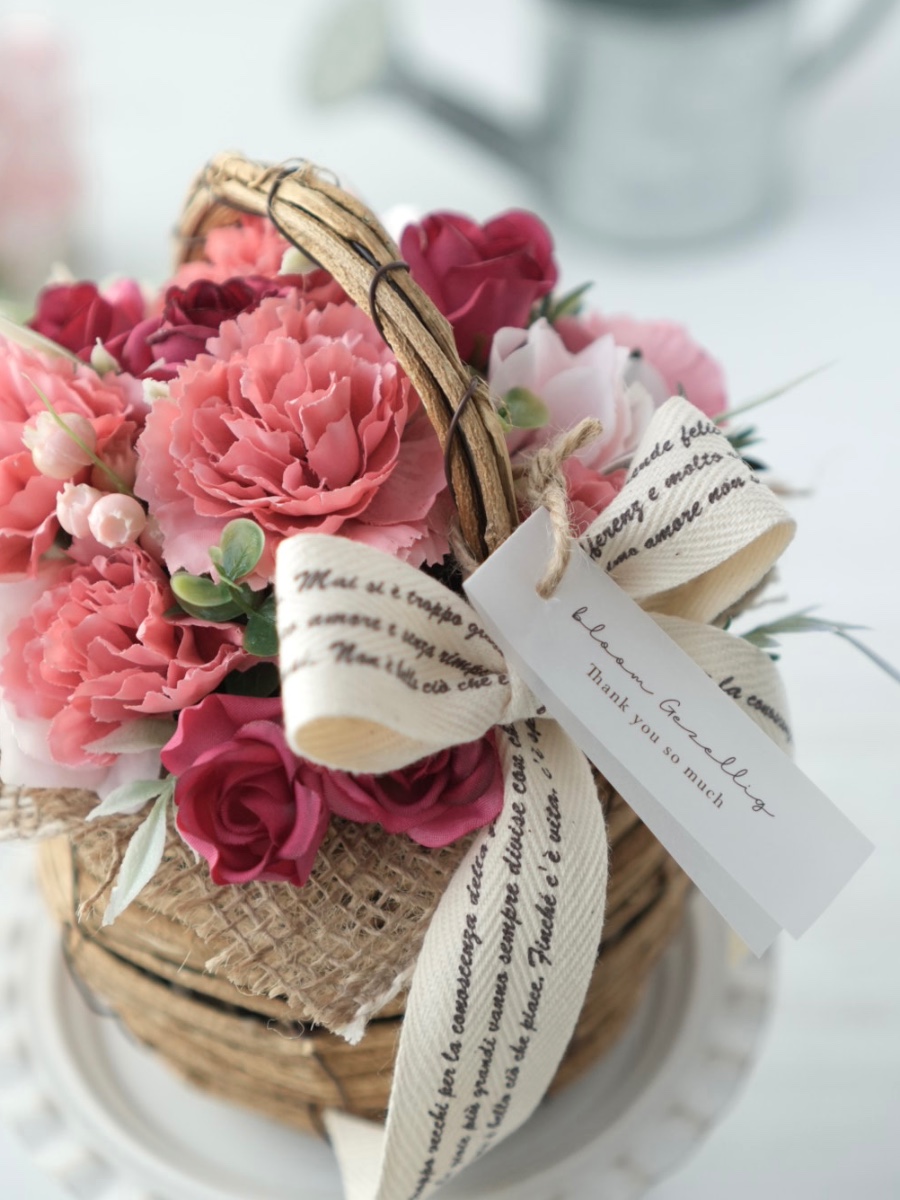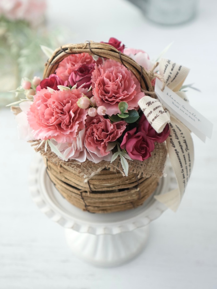 ピンクのカーネーションを主役に、やわらかな色合いのお花や濃いピンクのバラ、グリーンを合わせ華やかさを大切に仕上げました。