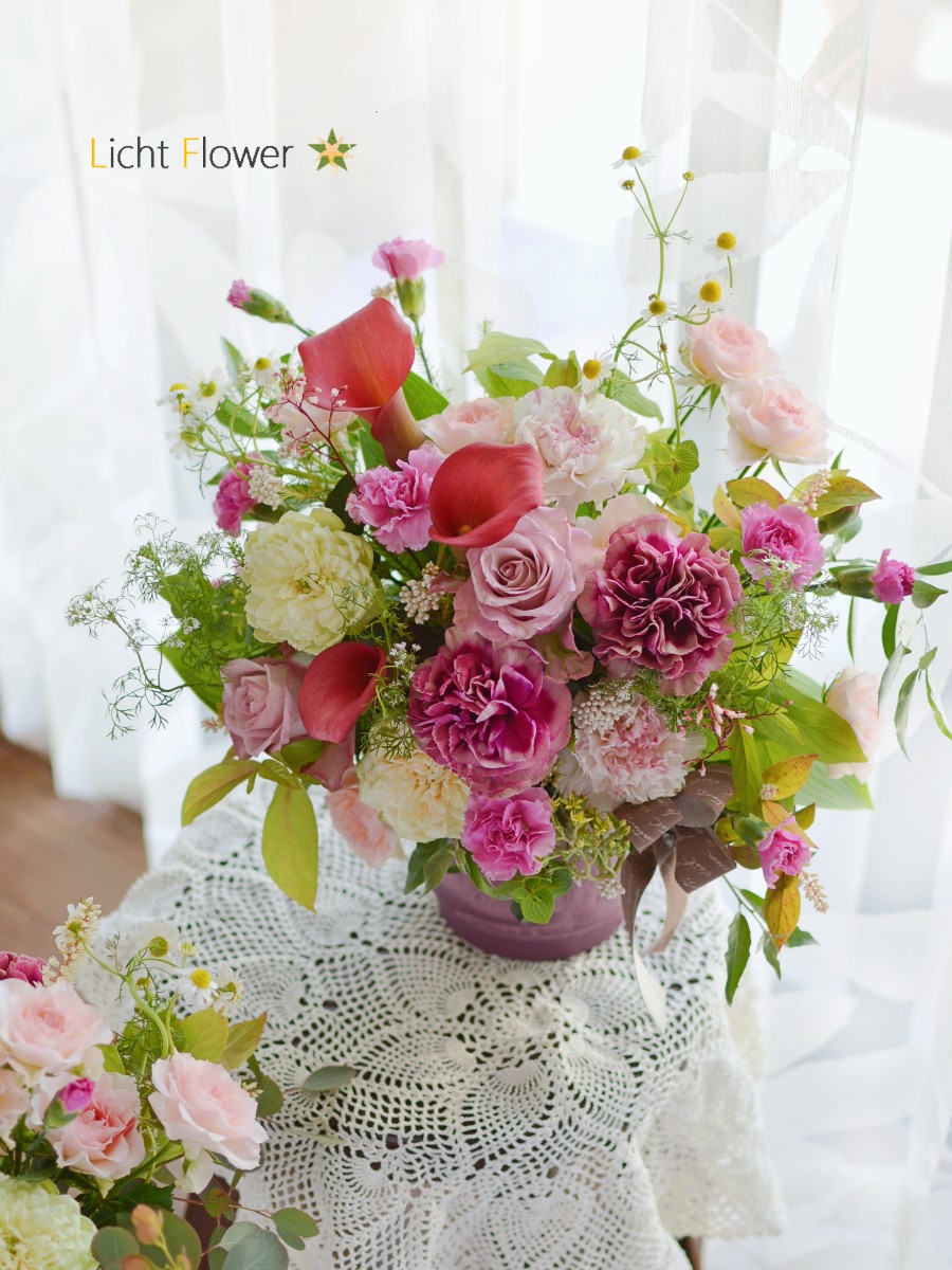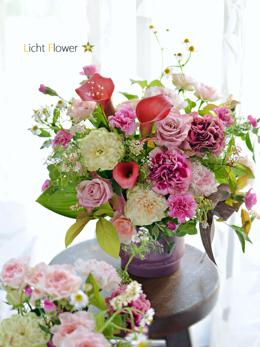 大人色のピンク~ボルドーカラーでまとめた、やわらかな季節を感じるアレンジメントです。