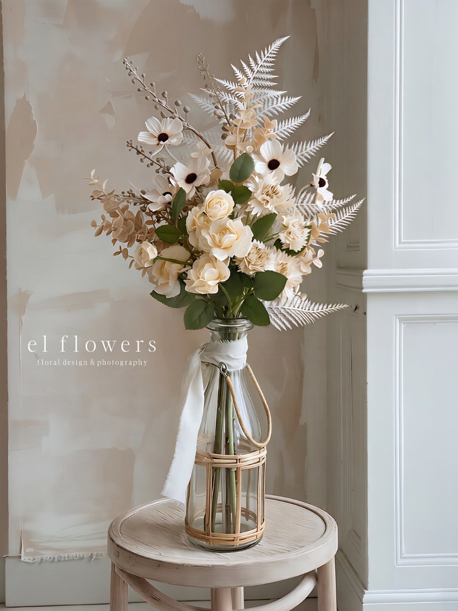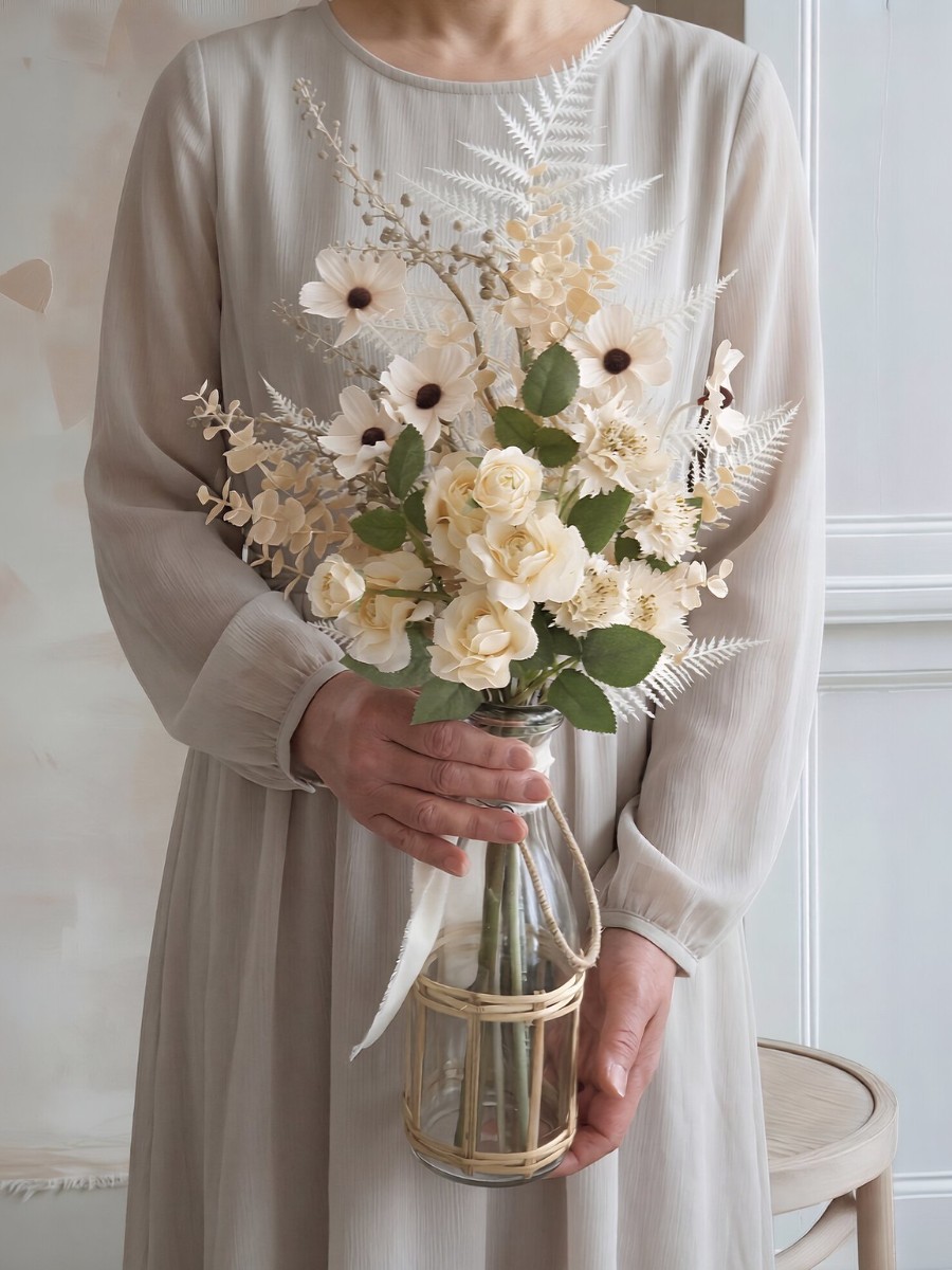 優しくお部屋に溶け込む、エクリュカラーのアレンジブーケとフラワーベースのセットです。