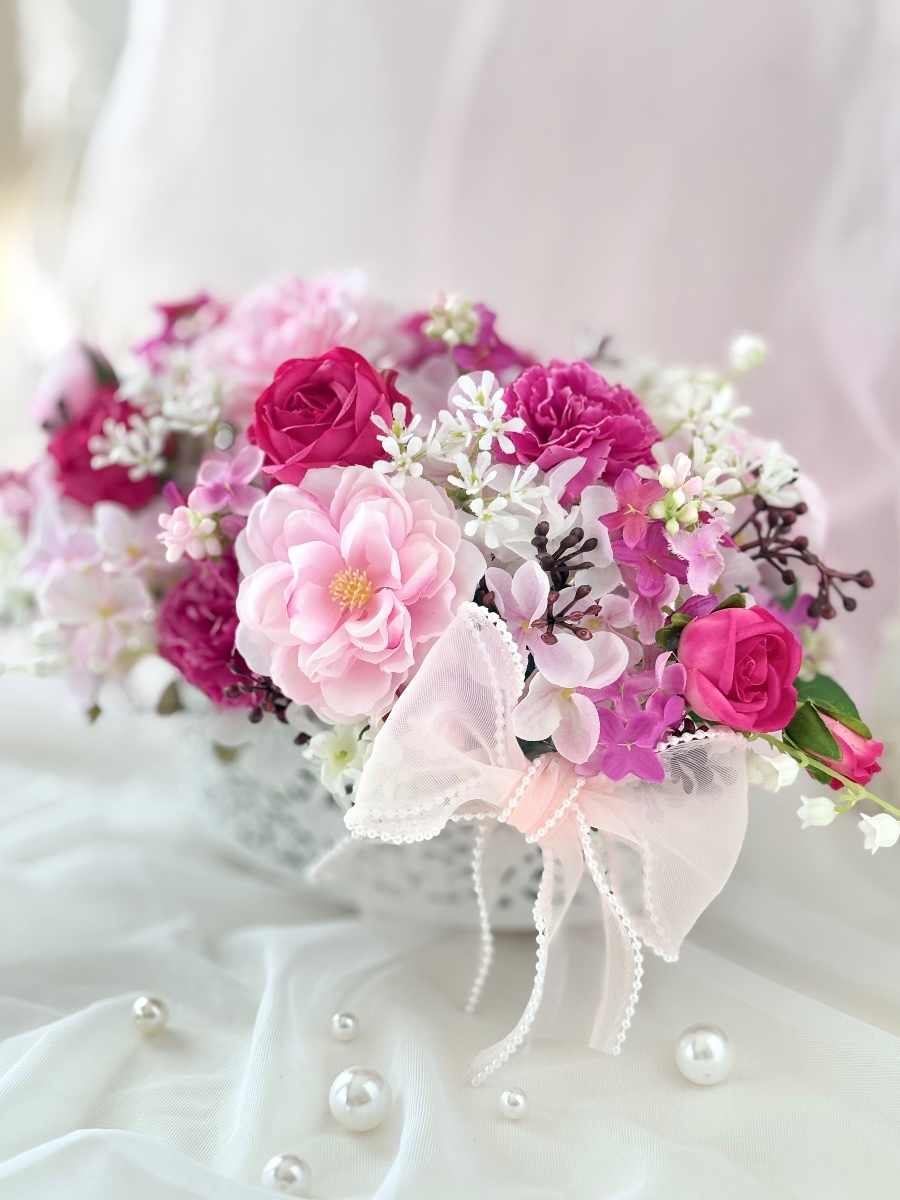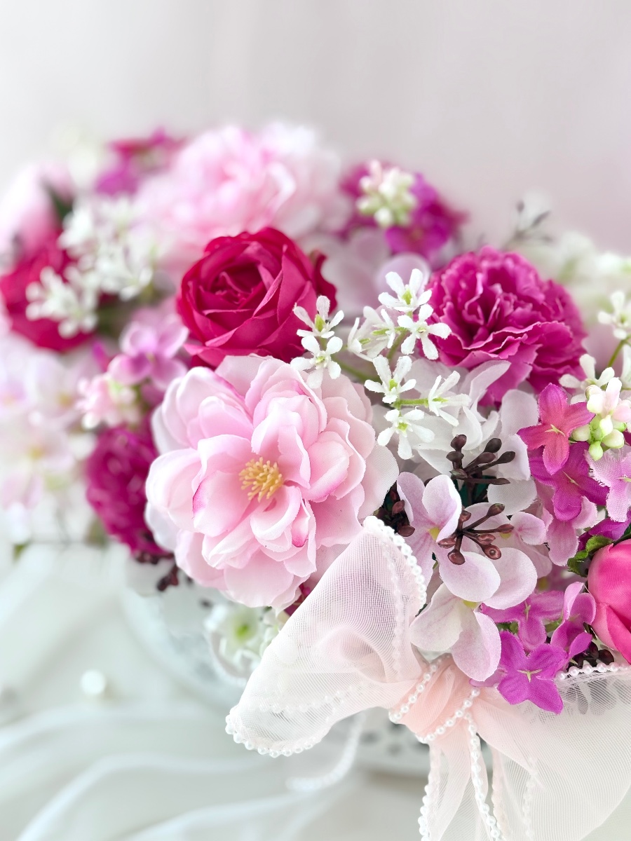 現在は、主にブライダルブーケ・リース・アレンジメントなどを制作・販売させていただいております。