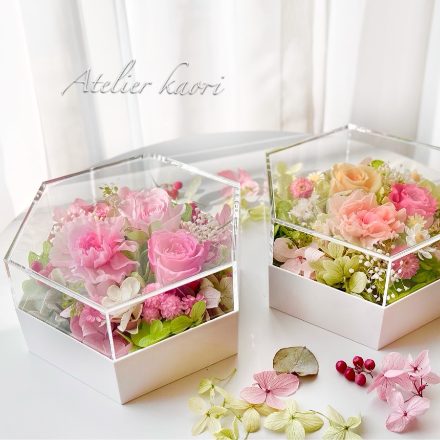 六角形のクリアケースに閉じ込めているので、お花に埃がつく心配がなく、美しい状態を長く楽しんでいただけます。