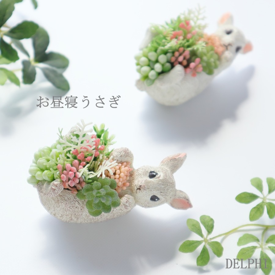 ごろんとした仕草が可愛いうさぎの花器にフェイクの多肉植物を寄せ植え風にアレンジしました。