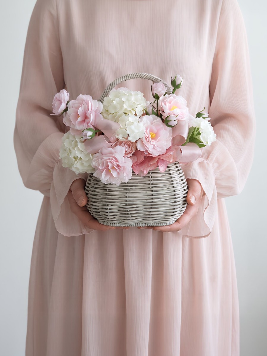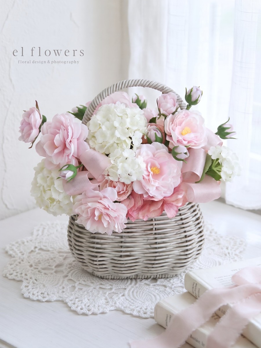 幾重にも重なる花びらが美しいピンクの「ガーデンローズ」を主役に、ふんわりとした「スノーボール」と「紫陽花」を贅沢にアレンジしたフラワーバスケットです。