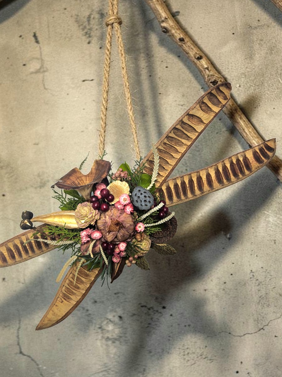 2本重ねたステップフルーツとフォームをワイヤーで固定して、木の実やお花、キノコなど個性的でワイルドな花材をあしらいました♪