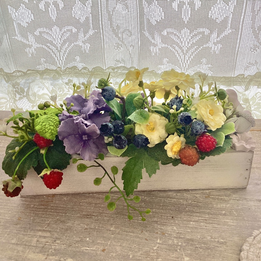 ラズベリーやブルーベリーなどの実ものに、優しいイエローやパープルの小花を合わせ、たっぷりのグリーンを添えて、大人可愛い雰囲気に仕上げました。