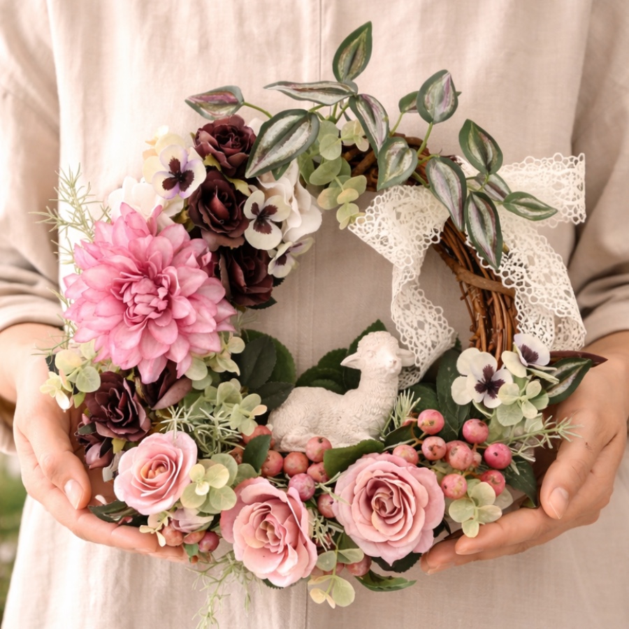優しいピンクのお花達に囲まれた、羊のアロマストーンが可愛いナチュラルリースで。
