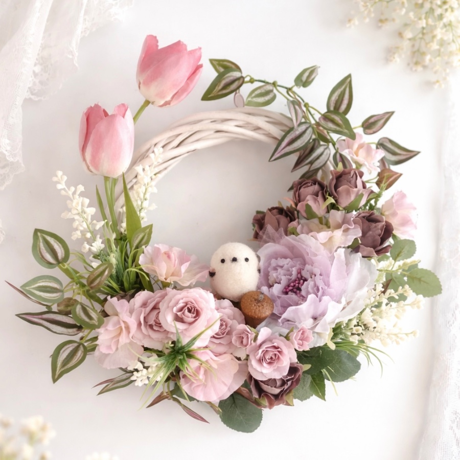 優しいお色のローズとチューリップのリースに、シマエナガがちょこんと止まり、