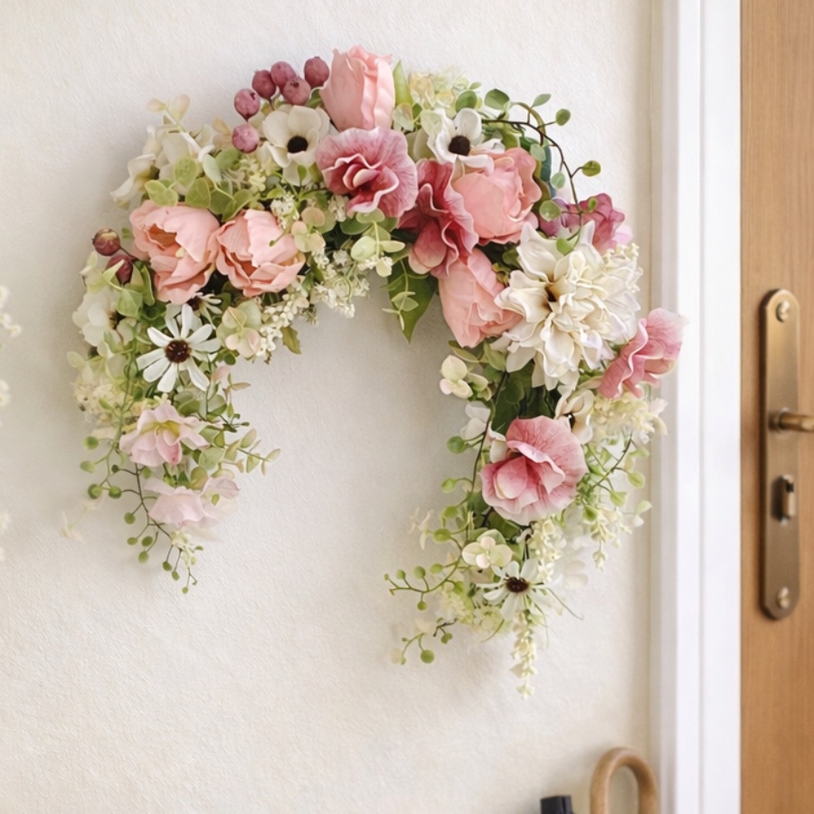 柔らかな春色チューリップと、ふんわり優しいスイートピーをたっぷりあしらった馬蹄型リースです。
