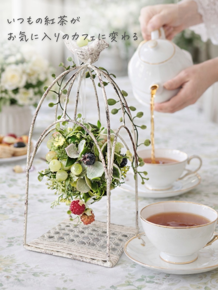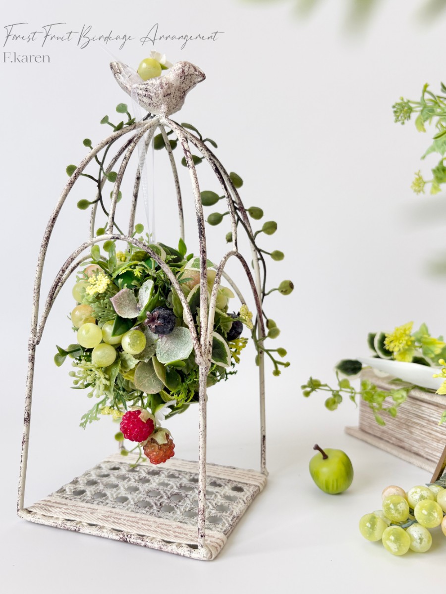 アンティーク調の白い鳥かごの中に、みずみずしいグレープやラズベリー、ブルーベリーをぎゅっと詰め込んだ、贅沢なフルーツボールを吊るしました。