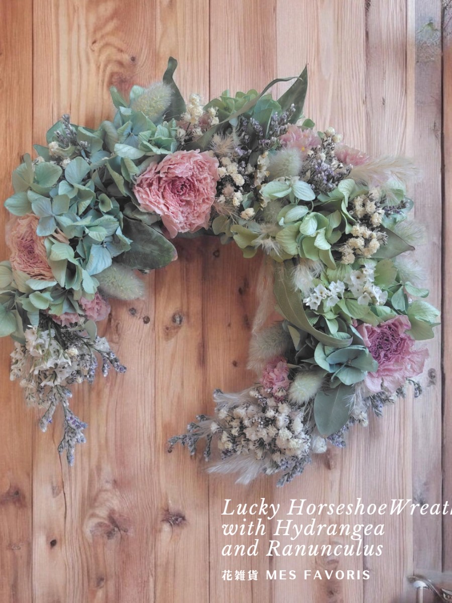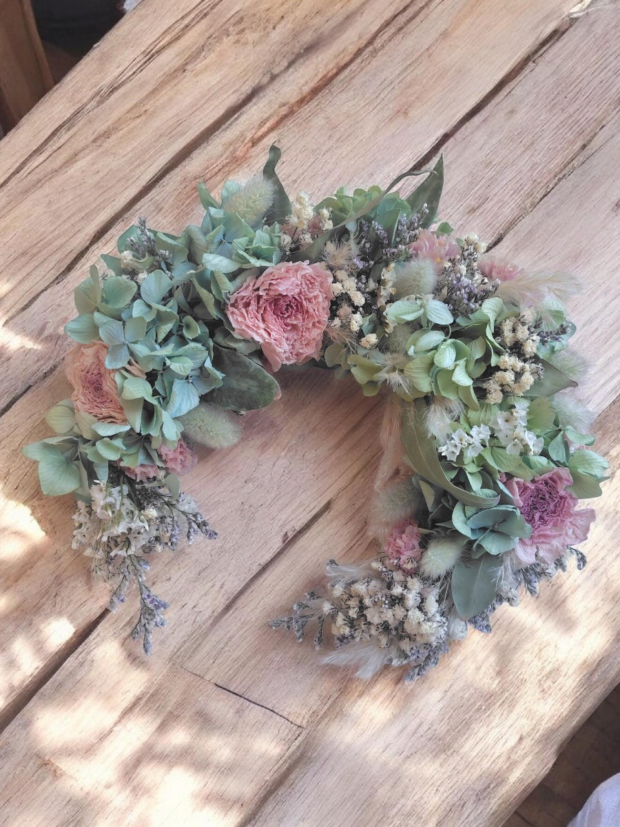 ブルーグリーンの紫陽花と、ピンクのラナンキュラスを中心に、カスミソウやスターチスなど、ドライ素材をたくさん使って作ったリースです。