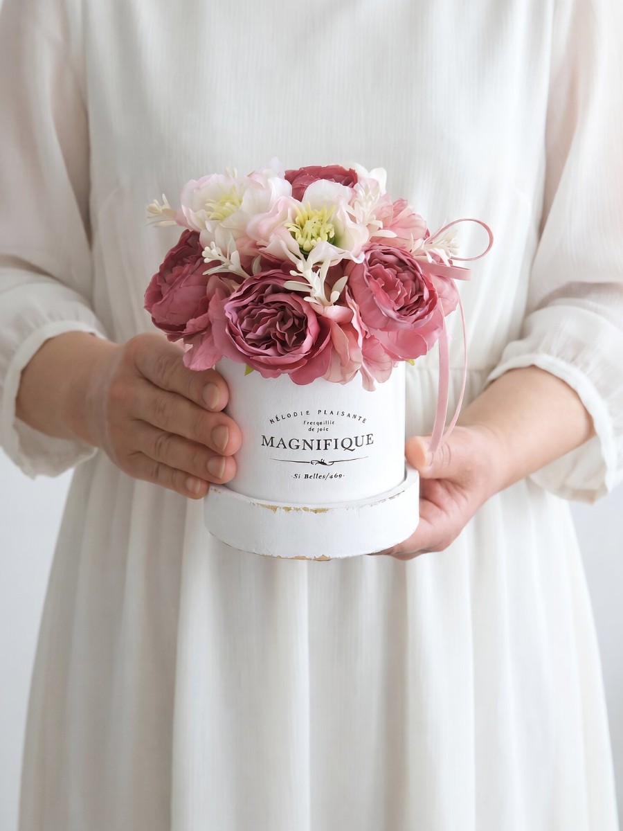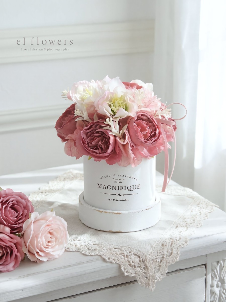 フレンチシャビーな雰囲気漂う、アンティーク調の木製ハットボックスに、たっぷりの花々を詰め込んだ大人可愛いアレンジメントです。