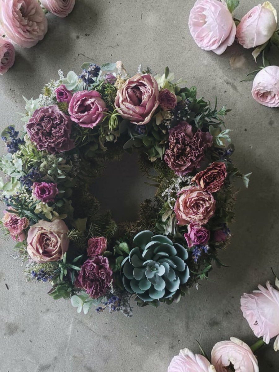 たっぷりのグリーンをベースに、ドライフラワーのバラとアーティフィシャルのエケベリアをあしらった表情豊かなリースです。
