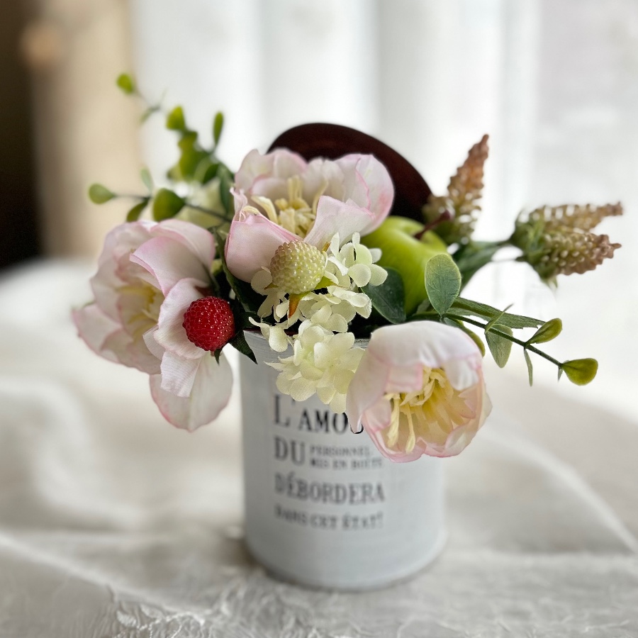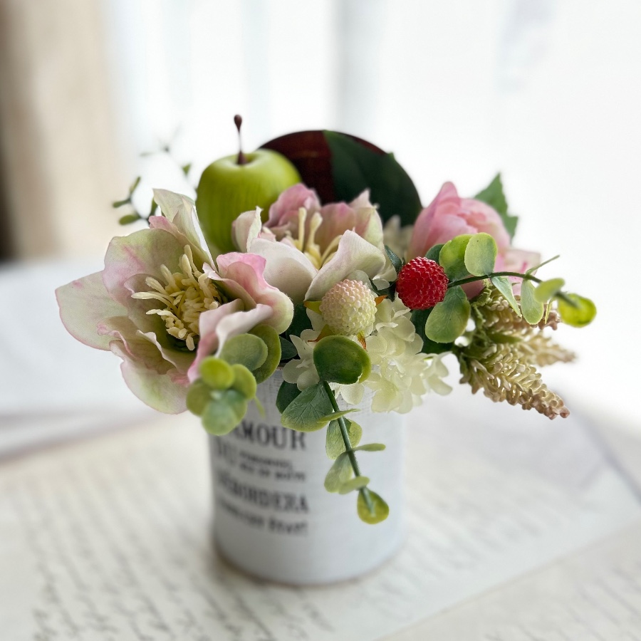 優しいピンクのクリスマスローズにベリーとグリーンアップルがアクセントのふんわり甘いアレンジメントです。