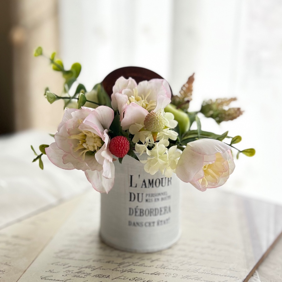 ブリキ缶の文字『L’AMOUR DU DÉBORDÉ』は、フランス語の溢れる愛を意味し、春の贈り物にも最適です。